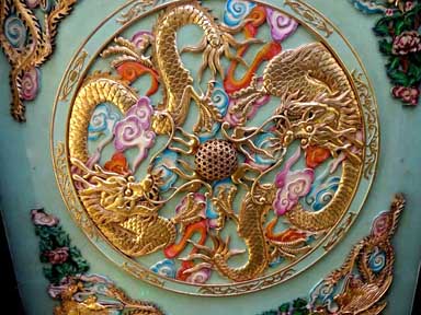 Some individuals suffer from the misconception that the Chinese Dragon is a symbol of evil. This erroneous belief stems from the mythology of the western world where the dragon was thought to abduct maidens, wreak havoc on the populace, steal gold and destroy villages. In the mediaeval context the Western dragon was often the symbol of Satan incarnate. This is not so in the dragons of the orient. In fact it is just the opposite. The dragons of China and Japan are almost exclusively benevolent mythological creatures. ... it has the following nine characteristics. Its head is like a camels, its horns like a deer's, its eyes like a hare's, its ears like a bull's, its neck like an iguana's, its belly like a frog's, its scales like those of a carp, its paws like a tiger's, and its claws like an eagle's. It has nine times nine scales, it being the extreme of a lucky number. On each side of the dragons mouth are whiskers, under its chin or floating just out of reach is a bright pearl, on the top of its head the 'poh shan' or foot rule, without which it cannot ascend to heaven. The scales of the dragon's throat are reversed. When exhaling its breath changes into clouds from which can come either fire or rain. The luminous ball or pearl often depicted under the dragon's chin or seen to be spinning in the air, pursued by one or two dragons is thought to be a symbolic representation of the 'sacred pearl' of wisdom or yang energy. The dragon's pearl can also be thought of as a symbol for universal Qi the progenitor of all energy and creation. The dragons seem to be depicted in attitudes of pursuit. He is seen to be reaching out eagerly to clutch at the elusive object, mouth open in anticipation and eyes bulging with anticipation of achieving the prize afforded by clutching the pearl. |
