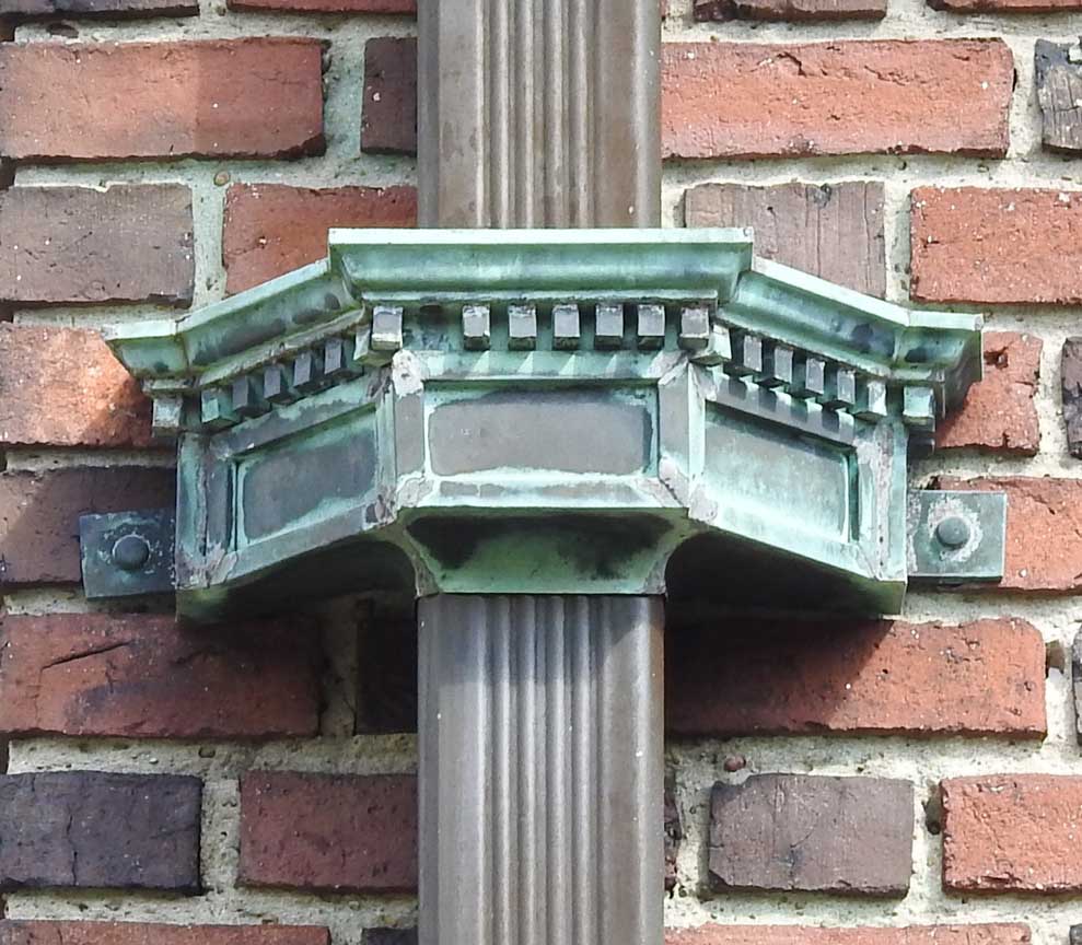 Conductor heads enhance the beauty and architectural style on a building. They are traditionally installed under the soffit.