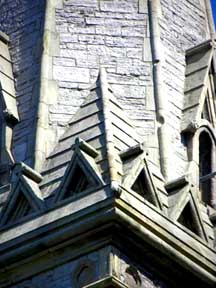 The junction, of an octagonal spire and a square tower involved a distinct architectural problem. A thirteenth century technical innovation in England, broaches are the triangular shapes clasping the spire above the top corners of the tower.