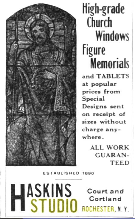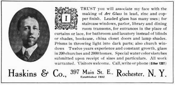 The company started its history in 1890 as W. M. Page & Co. In 1893 it became Parkes, Collyer & Stacy before becoming Haskins & Collyer in 1895. In 1904 it became Haskins Art Glass. Haskins worked predominately in opalescent glass. Many of the firm’s windows are located in Upstate New York. |