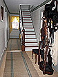 The original house, built circa 1840, was a one and a half story, three room cottage with two rooms divided by a plank wall on the first floor. A bedroom was over the present parlor. There was no hall at this time, a ladder being the way to the second floor.This long hall, part of a modernization, was added before 1855. Simple stairs by the front door were replaced by a more elaborate Greek Revival stairway with a cherry newel and railing.