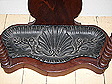Empire style lyre clothes rack and umbrella stand - cast iron bottom umbrella tray has center shell flanked by flowers and surrounded by leaf pattern around edges |
