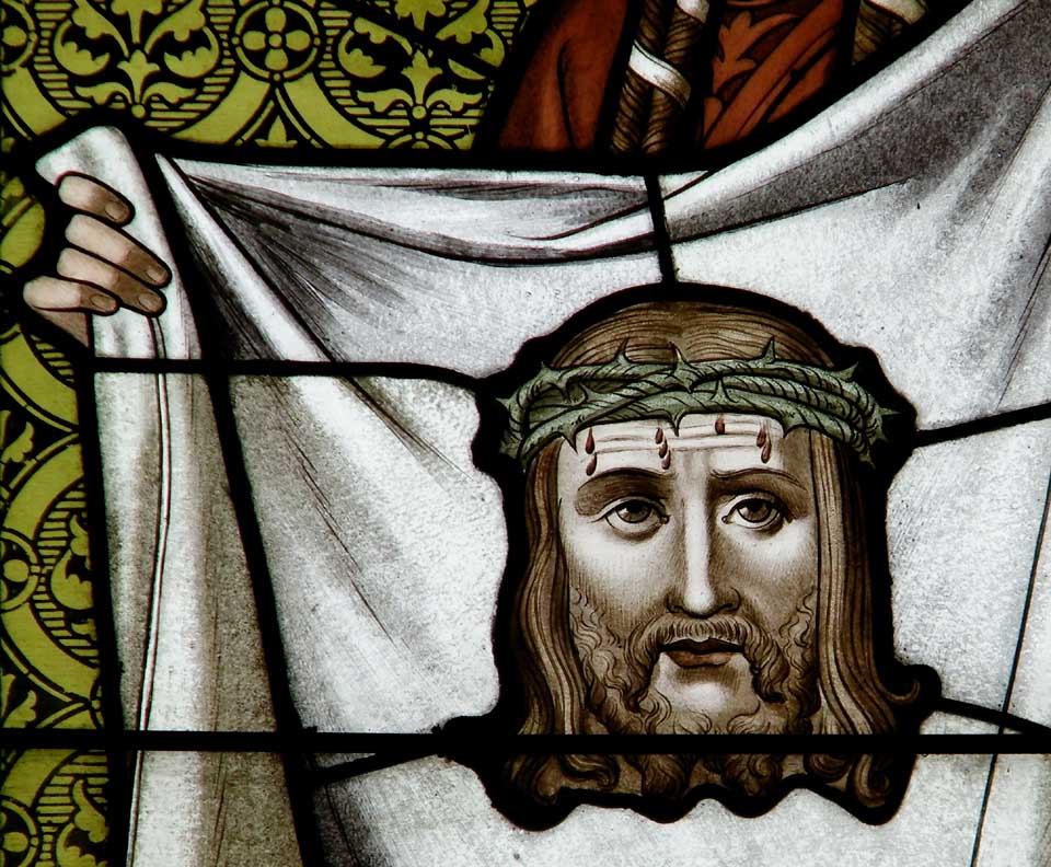 | Saint Veronica - Detail Veronica from Jerusalem encountered Jesus along the Via Dolorosa on the way to Calvary. When she paused to wipe the sweat off his face with her veil, his image was imprinted on the cloth. See Iconography in Art and Architecture: Saint Veronica LARGER SIZE beneath top photo |