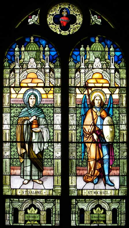 | St. Salome / St. Michael St. Salome was the wife of Zebedee and mother of James and John (Matt. 27: 56; cf. Matt. 20: 20), one of the women from Galilee who was present at the crucifixion (Mark 15: 40) and came to the tomb (Mark 16: 1) and received the message that Jesus had been raised. See Iconography in Art and Architecture: Saint Salome St. Michael is an archangel in Jewish, Christian and Islamic tradition. He is viewed as the field commander of the Army of God. He is mentioned by name in the Book of Daniel, the Book of Jude and the Book of Revelation. In the English epic poem Paradise Lost by John Milton, Michael commands the army of angels loyal to God against the rebel forces of Satan. Armed with a sword from God's armory, he bests Satan in personal combat, wounding his side. See Iconography in Art and Architecture: Saint Michael LARGER SIZE beneath top photo |