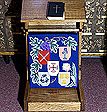 Memorial needlepoint cushion on prie dieu. Placed upright to better viewing |