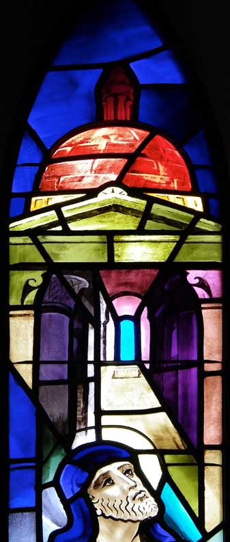 The last of the books of the prophets of the Old Testament. Shown in front of the altar of the Temple holding a plate of food intended to be sacrificed to God (Malachi 1:7), in contempt of the Temple priests who were not accepting worthy animal or cereal sacrifices from the people