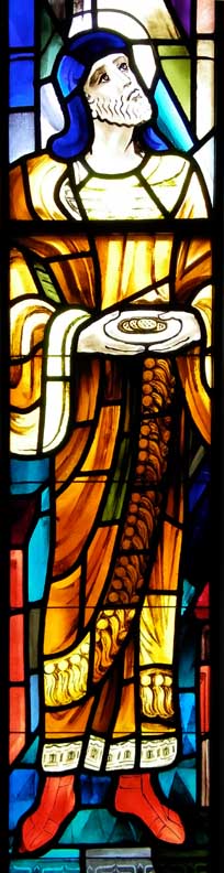 | Detail - Malachi The last of the books of the prophets of the Old Testament. Shown in front of the altar of the Temple holding a plate of food intended to be sacrificed to God (Malachi 1:7), in contempt of the Temple priests who were not accepting worthy animal or cereal sacrifices from the people Iconography in Art and Architecture: Malachi LARGER SIZE beneath top photo |