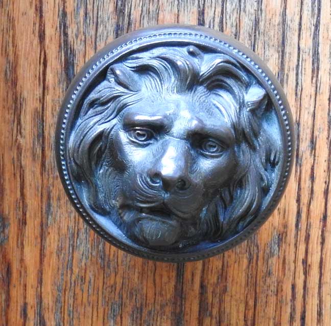 ![]() Tudor Revival style ... Details below: ![]() Flared roof with slate shingles ![]() Terra cotta chimney pots ... Slate roof ![]() Copper conductor head ![]() Tudor Revival ... Half-timbering ![]() Slate roof ![]() Tudor Revival ... Porte-cochere ![]() Finial and pendant finial ![]() Porte-cochere ![]() Leaded glass lattice windows ... Plank door with Tudor arch ... Five door details below: ![]() Engaged twisted columns ... Three details below: ![]() Frieze: grape vines ... Foliated spandrels ![]() Grape vines ![]() Acanthus leaves ![]() Door handle: lion face ![]() Carved bargeboard beneath flared gable roof ... Half-timbering ![]() Flemish bond ![]() Side door ... Knocker detailed below: ![]() Door knocker |