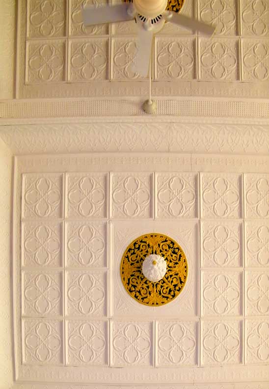 Ceiling: Sheet metal ceiling covering with Gothic Revival patterns