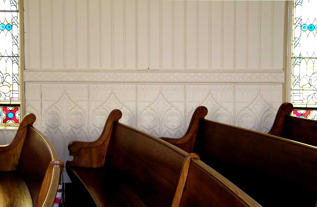 Sheet metal wall covering with Gothic Revival pattern, featuring trefoils and quatrefoils