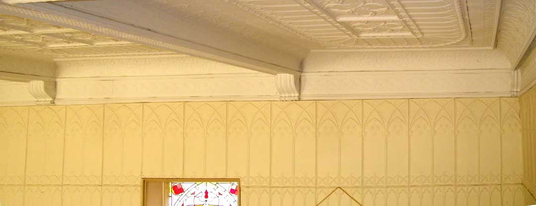 Sheet metal wall and ceiling covering with Gothic Revival pattern