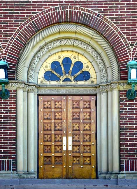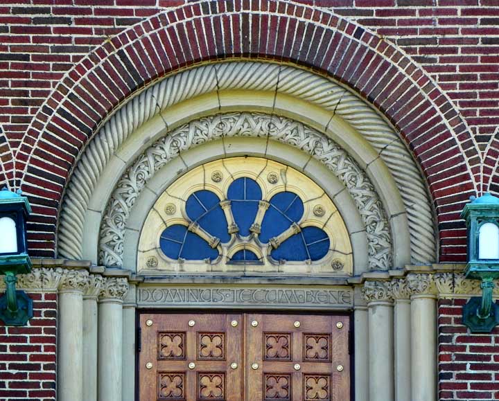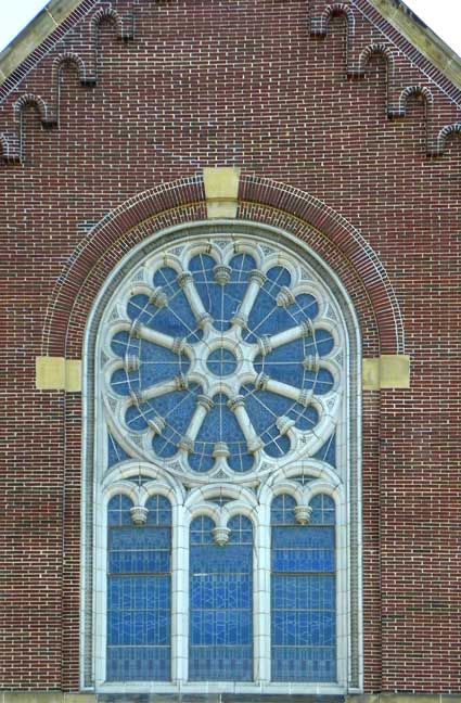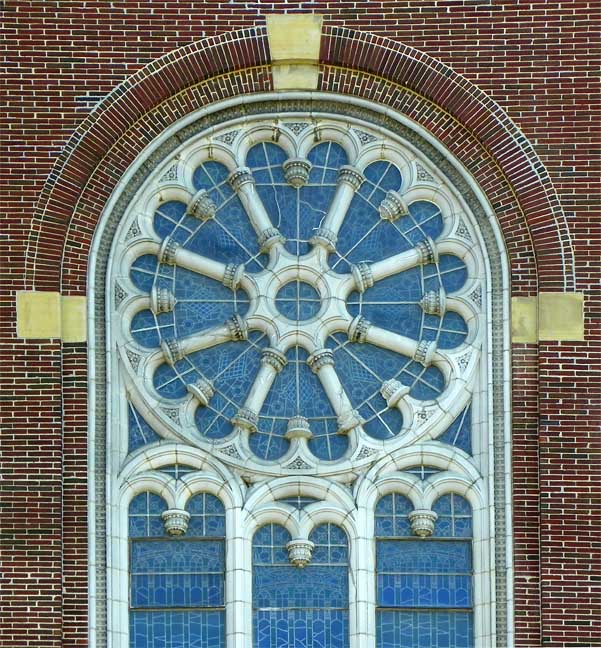 Façade![]() Final (cross) ..... Lantern ..... Belfry ![]() Corbel table ![]() Rose (wheel) window ![]() Tracery ![]() ![]() ![]() Voussoirs ..... Rope molding ..... Stained glass in tympanum ..... Quatrefoil panels in door |