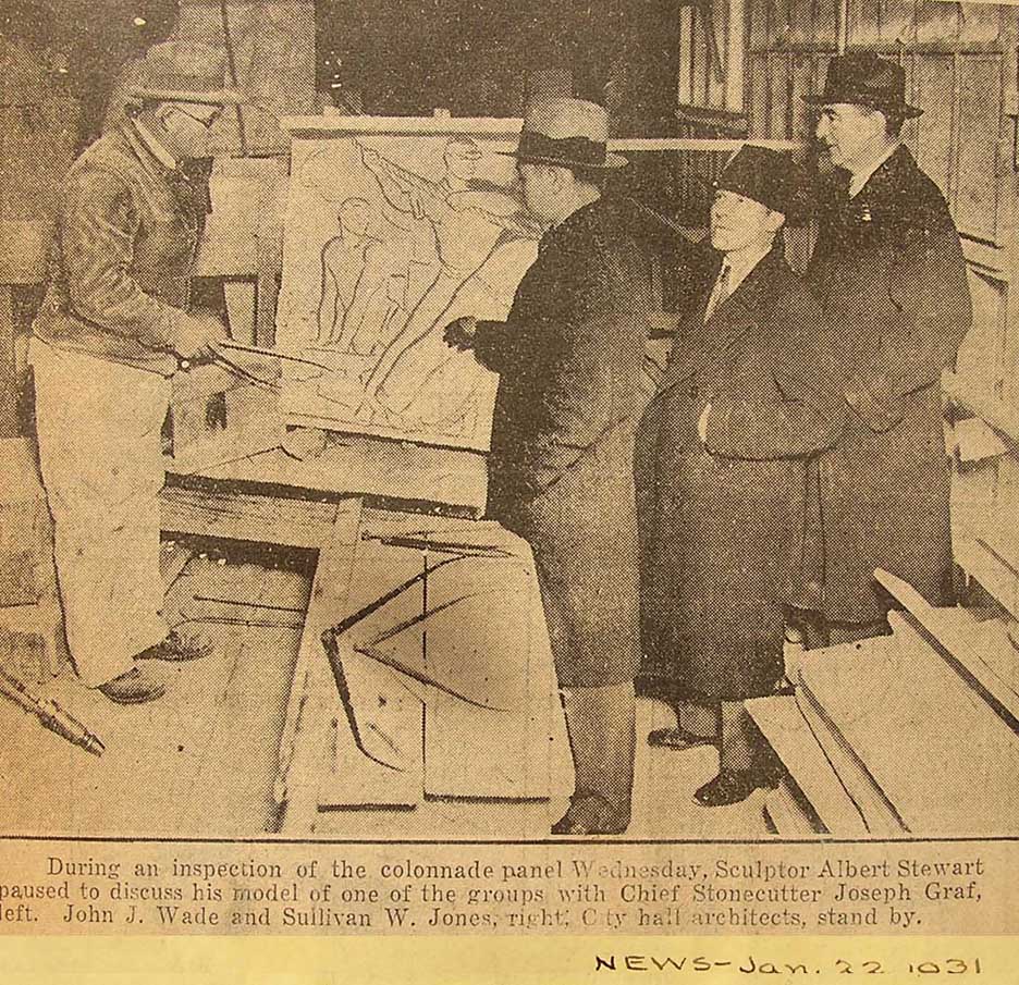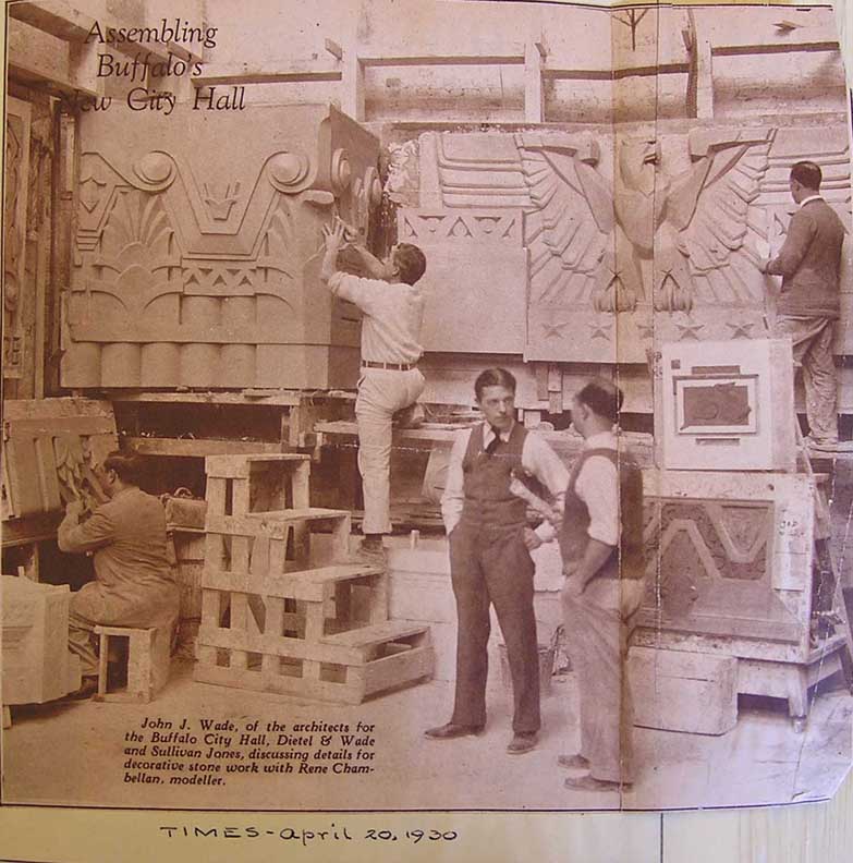 In 1926, when the City Architect's city hall design was found unsatisfactory, the Common Council turned to amiable, quick-witted, 33-year-old John Wade, who probably had more practical experience with the planning and design of city halls than any other local architect.John J. Wade, a young architect who had experience in the design of city halls, had written an article in 1925 in The Buffalo Arts Journal called "Choosing a City Hall Architect," which brought him to the attention of the Common Council. They hired him as a consultant architect for the design of City Hall, January, 1927. He formed a partnership with Buffalo architect George J. Dietel (1876-1974) to provide these services.
