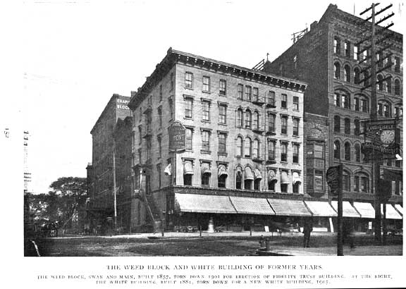 The Weed Block, Swan and Main, built 1857, torn down 1901 for erection of Fidelity Trust Building. At the right, the White Building, built 1881, torn down for a new White Building, 1905. Source: "The Picture Book of Earlier Buffalo," Frank H. Severance, ed. Buffalo Historical Society Publications, Vol. 16, 1912, p. 152 (online) |