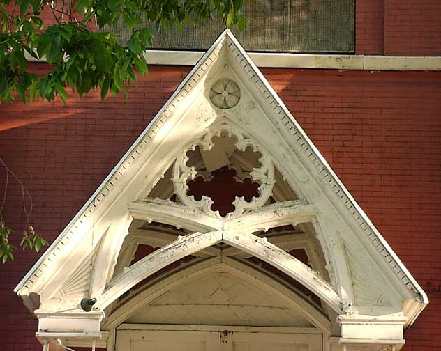 ![]() First Free Baptist Church, Hudson at Fargo Sts. Note entrance (detail in next photo) ![]() First Free Baptist Church Gable roof over front entrance: Dentils ..... Patera ..... Multifoil |