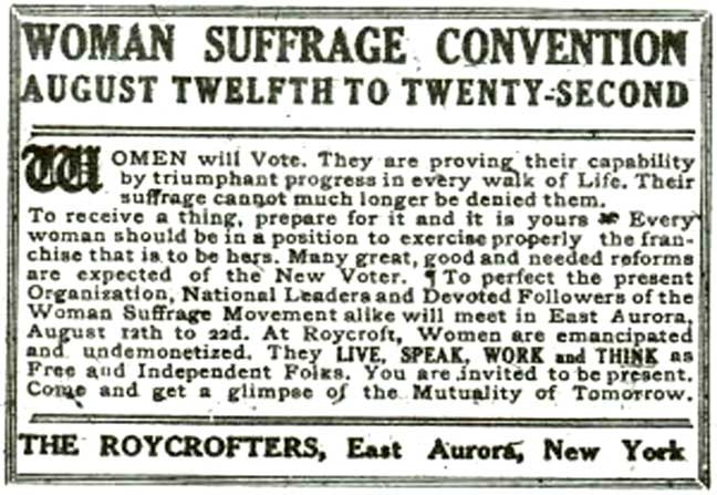 The issue had been of particular interest to Elbert and Alice Hubbard, who led a strong women’s suffrage movement from their Roycroft Campus in East Aurora. In fact, the Roycrofters hosted a number of suffrage meetings and conventions. In an advertisement for a “Woman Suffrage Convention” Aug. 12 to 22, 1909, which attracted speakers from across the country, the Roycrofters proclaimed: “Women will vote. They are proving their capability by triumphant progress in every walk of life. Their suffrage cannot much longer be denied them….At Roycroft, women are emancipated and undemonetized. They live, speak, work and think as free and independent folks.”