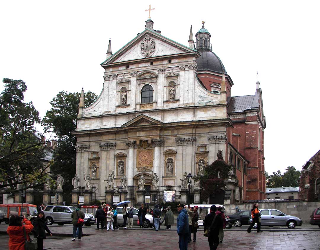 It was the first Baroque church in Cracow, built in response to the arrival of the Jesuits in Poland in 1583. The Society of Jesus was first based at the church of St. Barbara, but at the end of the 16th century the new church was begun. This had to be demolished shortly after construction began because of severe miscalculations.After further vicissitudes the new commission was given to Giovan Battista Trevano, who also built the St. Stanislaw mausoleum in the Cathedral on Wawel. Above the crossing is a large dome, recently restored,. The dome was completed in 1619 and its decoration in 1633.