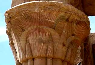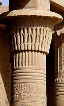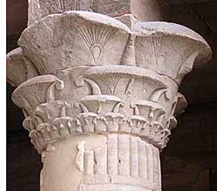 Most of the time, the columns shafts were copies in stone of supports made from plants, resembling either a trunk or a bundle of stems of smaller diameter. Also the shape of the capital, the top of the column, also had a plant theme, and at the transition of the capital to the shaft, five bands might be found representing the lashing which held together the bundle of stems of which the earliest columns were made. Above the capital a low abacus usually connected the column to the architraves placed above it.