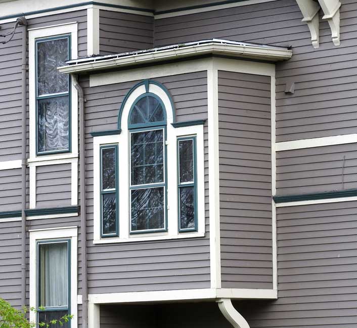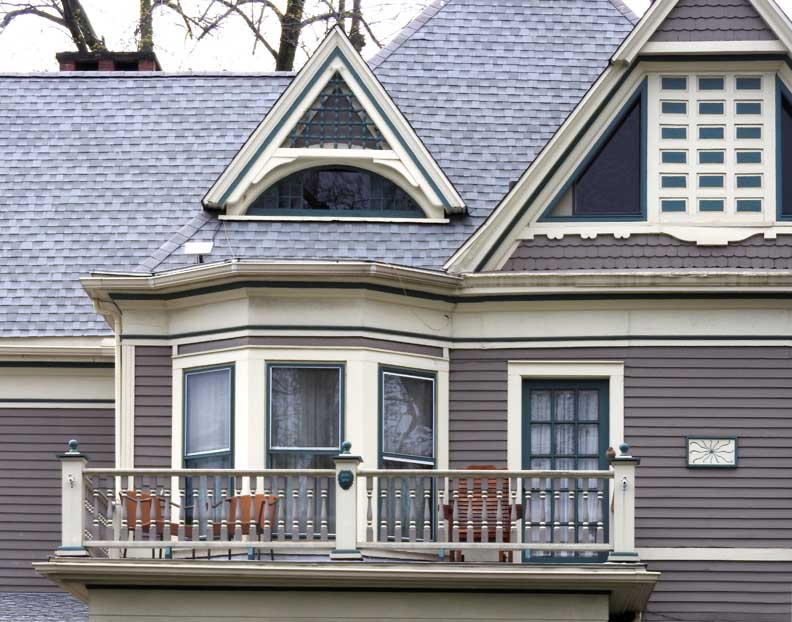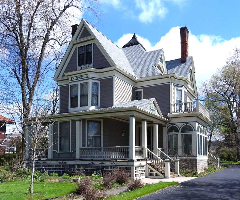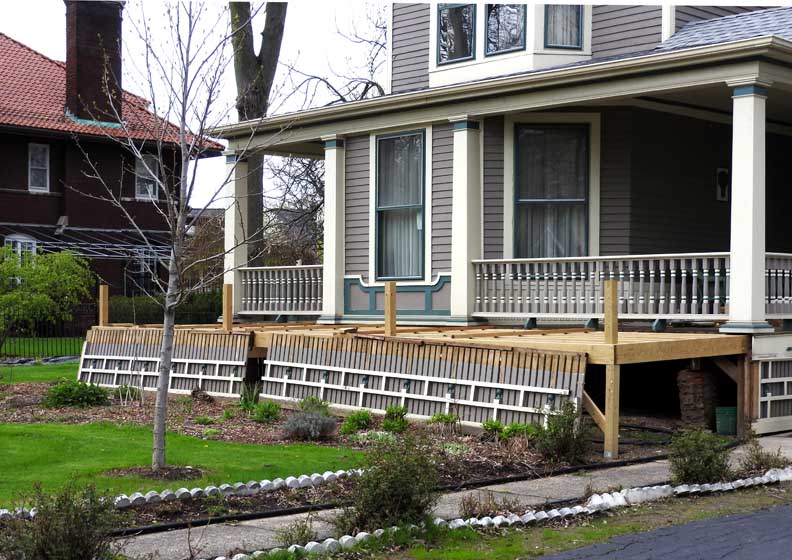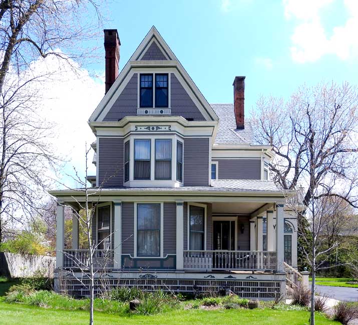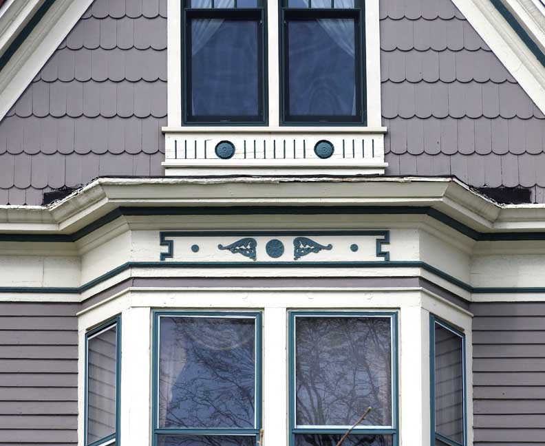 2017 photos![]() SW elevations ... Queen Anne style ... Stick style ![]() West elevation ![]() Gable windows flanked by wooden shingles ![]() Fluting and bull's eye paterae below dormers ![]() Note porch floor extension under construction (detail below:) ![]() ![]() ![]() ![]() |