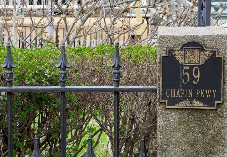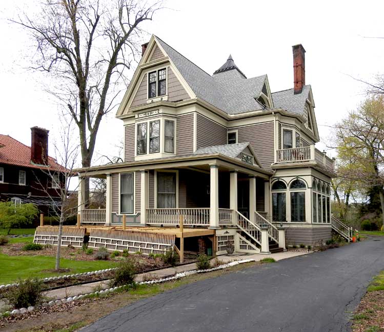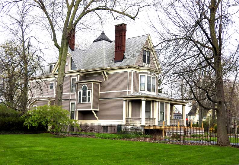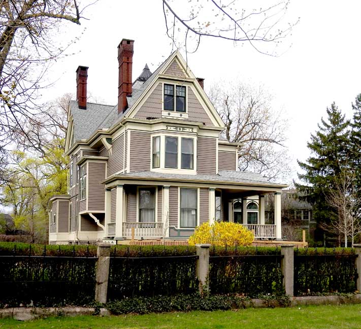 Built for John J. Crawford 2 1⁄2-story cross gable frame residence with Queen Anne styling; wood clapboard siding, asphalt shingle roof. Full width open entry porch, square wood supports, spindlework balustrade, wood door with sidelights. Windows typically 1/1 wood sash double hung or multi-light wood casement. Decorative woodwork at gable ends. Wrought iron and concrete gate. Cannot see secondary building from public right-of-way. - Elmwood Historic District (EAST) National Register of Historic Places Nomination p. 92See also: National Register of Historic Places Nomination: Frederick Law Olmsted – Parks and Parkways |