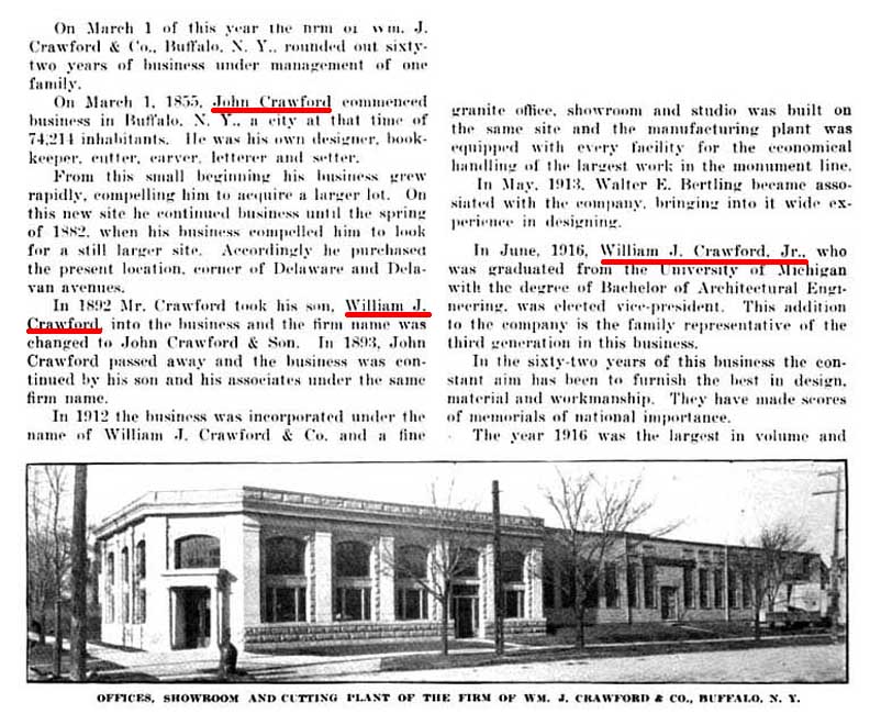 ![]() Source: Granite Marble & Bronze, Volume 27 No. 1, January 1917, p. 38 John J. Crawford - 59 Chapin Parkway William J. Crawford (son) - 844 West Delavan Avenue |
