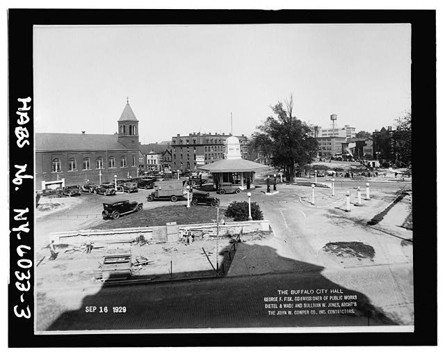 The site for City Hall. Note St. Anthony's in left background Source: Historic American Buildings Survey/Historic American Engineering Record (27 photos, 16 data pages). Type: Buffalo City Hall. Photographer: Unknown