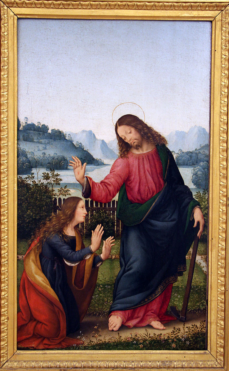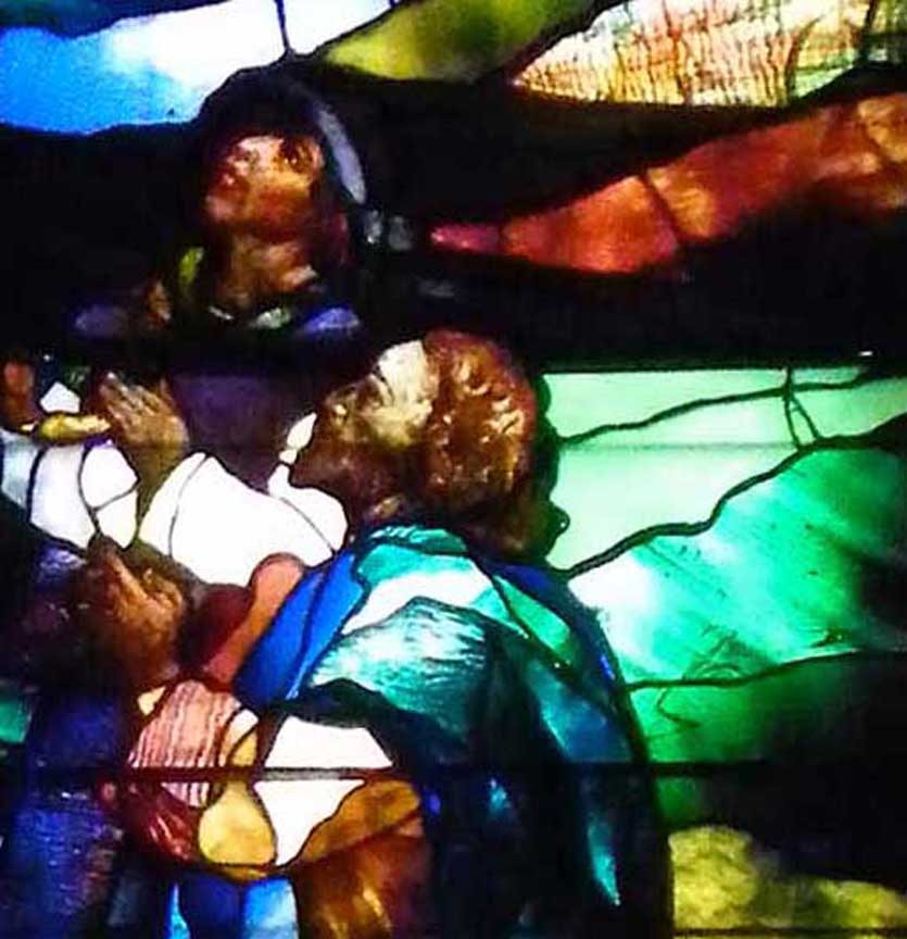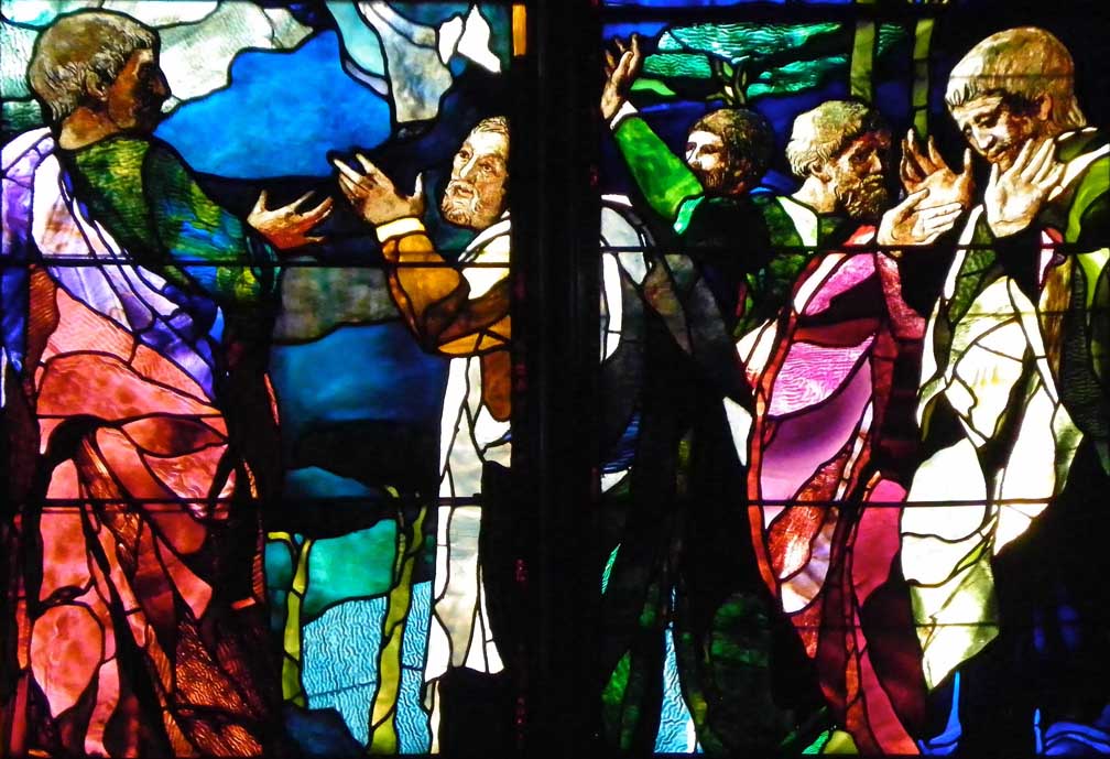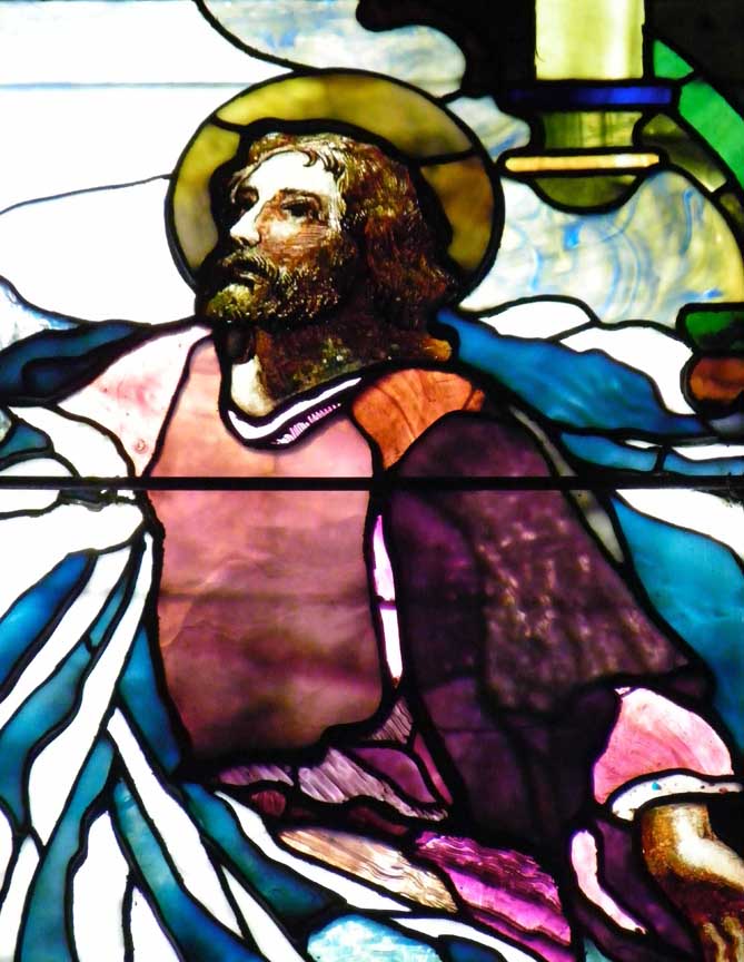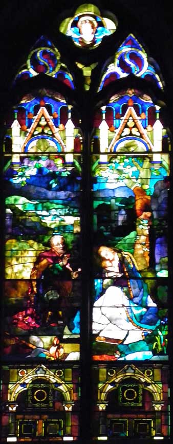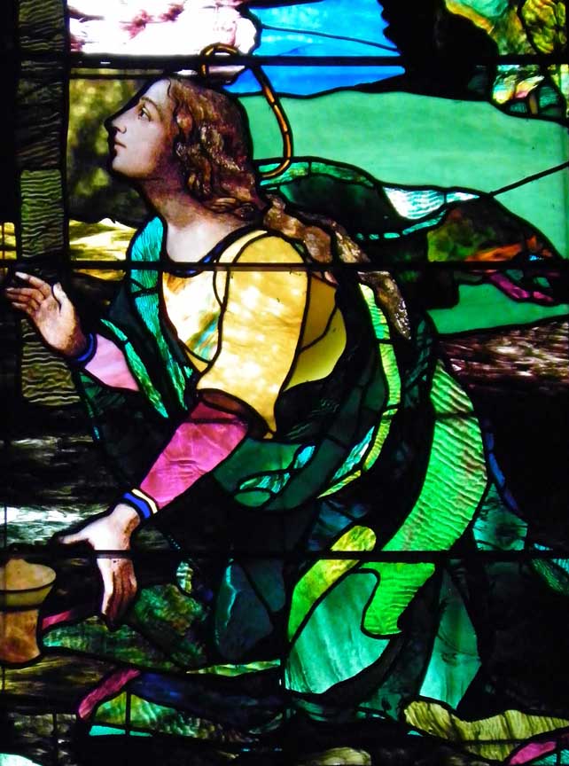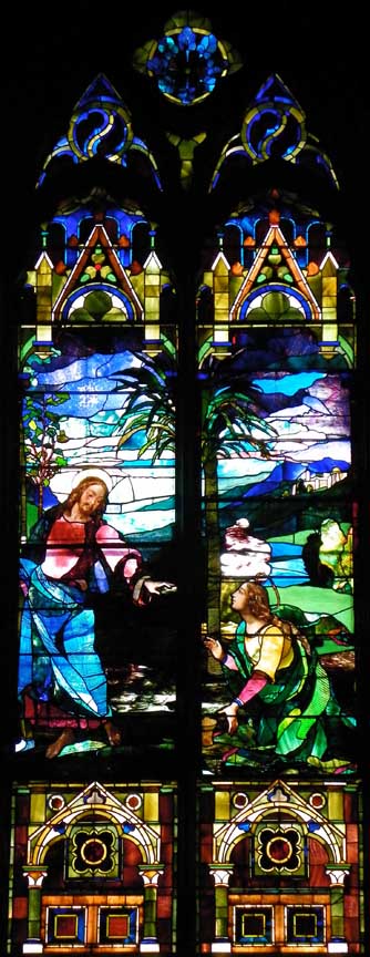 Noli Me Tangere ...........![]() LEFT: John LaFarge, Noli Me Tangere Iconography in Art and Architecture: Resurrection Based on a painting by Florentine Renaissance artist Lorenzo di Credi, the window shows Mary Magdalene returning to the empty tomb and mistaking the risen Christ for a gardener. When she then recognizes Him and reaches out, he tells her, "Do not hold on to me, because I have not yet ascended to the father," and sends her to tell the disciples. The landscape features a palm tree, a symbol of victory over death, and Jerusalem is suggested in the background. Given by Charlotte Sherman Watson in memory of her husband, Stephen van Renssalaer Watson, a vestryman of the old Trinity church. (She also commissioned another LaFarge window, The Sealing of the Twelve Tribes, that is found in the side chapel of the church.) ... Three details below: ![]() Noli Me Tangere (Resurrection) detail #1 - The landscape features a palm tree, a symbol of victory over death, and Jerusalem is suggested in the background. ... Iconography in Art and Architecture: Palm tree ![]() Noli Me Tangere (Resurrection) detail #2 ... This window was given by Charlotte Sherman Watson in memory of her husband, Stephen van Renssalaer Watson, a vestryman of the old Trinity church. ... Charlotte Sherman Watson also commissioned another LaFarge window at Trinity, The Sealing of the Twelve Tribes ![]() Noli Me Tangere (Resurrection) - Detail #3 |
