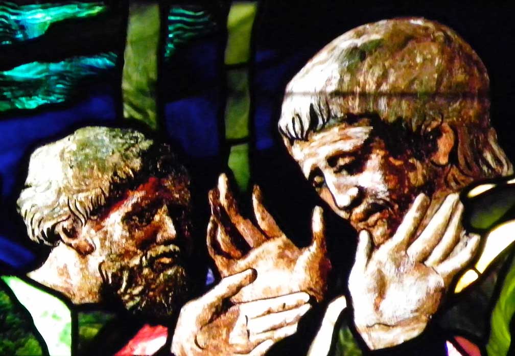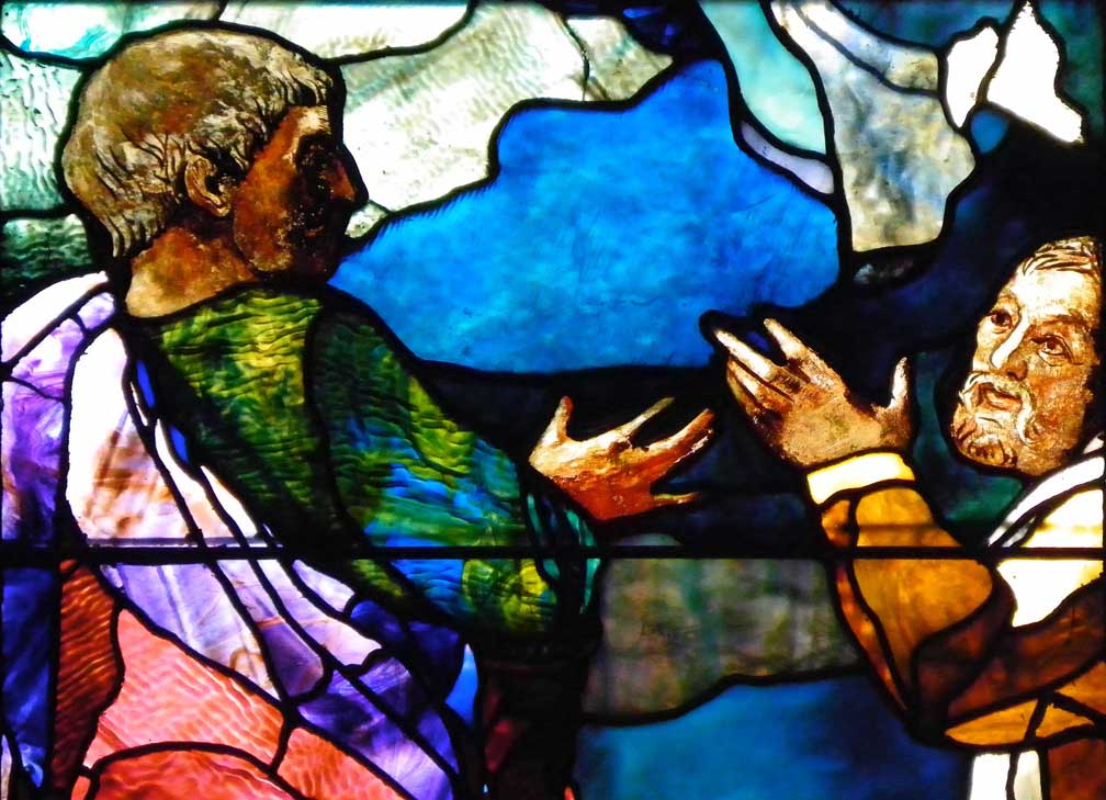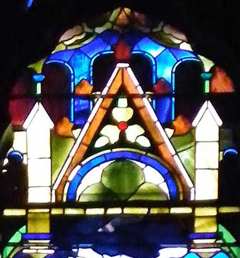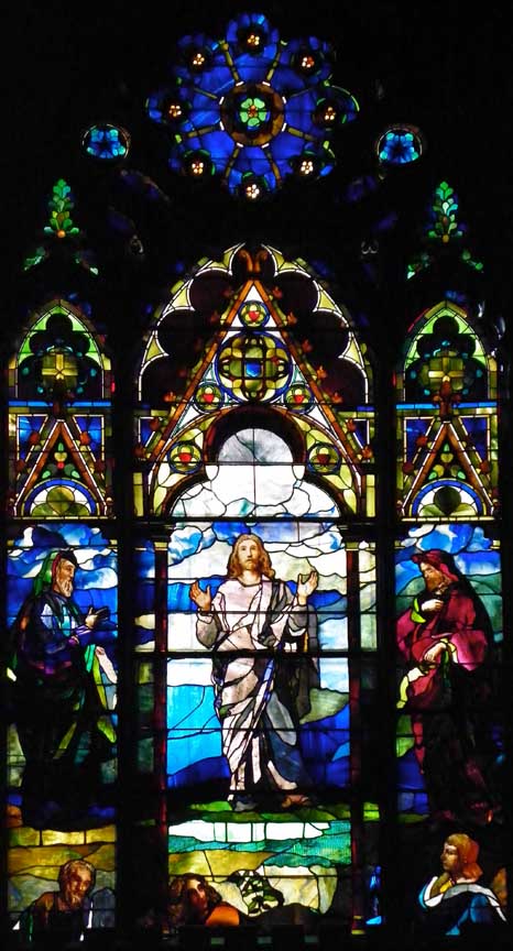 Transfiguration ...Transfiguration ... In the central Transfiguration window, Peter, James, and John accompany Jesus to a mountaintop where they see the transfigured Christ converse with Moses and Elijah. ... Iconography in Art and Architecture: Transfiguration ... Based on a painting by Venetian artist Giovanni Bellini ... Three details below: ![]() Transfiguration detail #1 - Multifoil wheel window ... Two mouchettes ![]() Transfiguration detail #2 - Moses holding the Ten Commandments ![]() Transfiguration detail #3 - Jesus |