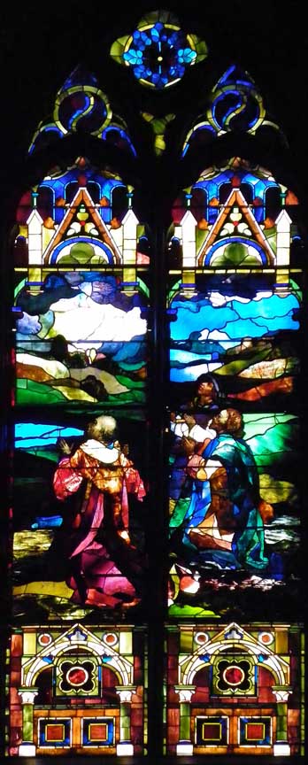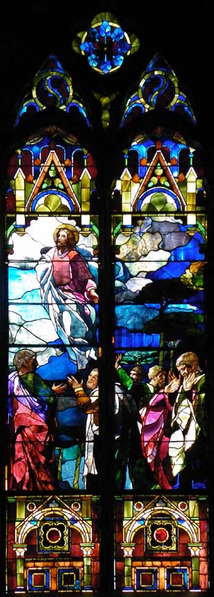 Ascension .............![]() LEFT: Ascension, by John LaFarge ... Iconography in Art and Architecture: Ascension ... RIGHT: LaFarge adapted Andrea Mantegna's ca. 1460 Ascension painting for his Ascension window. Seven LaFarge Ascension details below: ![]() Ascension detail #1 - Quatrefoil at top ... Paired trefoils with mouchettes ![]() Ascension detail #2 - Opalescent glass ![]() Ascension detail #1 - Apostles ... Faces and hands enamel painted and refired ... Rest of the glass is opalescent ![]() Ascension detail #4 - ![]() Ascension detail #5 - ![]() Ascension detail #6 - ![]() Ascension detail #7 - Predella |
