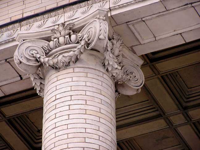 2003 photo. What is unusual is that the tall circular columns, instead of being made of stone, are constructed of light-colored brick that has been formed in curvilinear shapes. Laurel leaves draped on Ionic capital