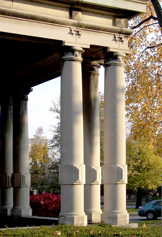 Portico: (Indiana?) limestone banded columns with nail-head motif