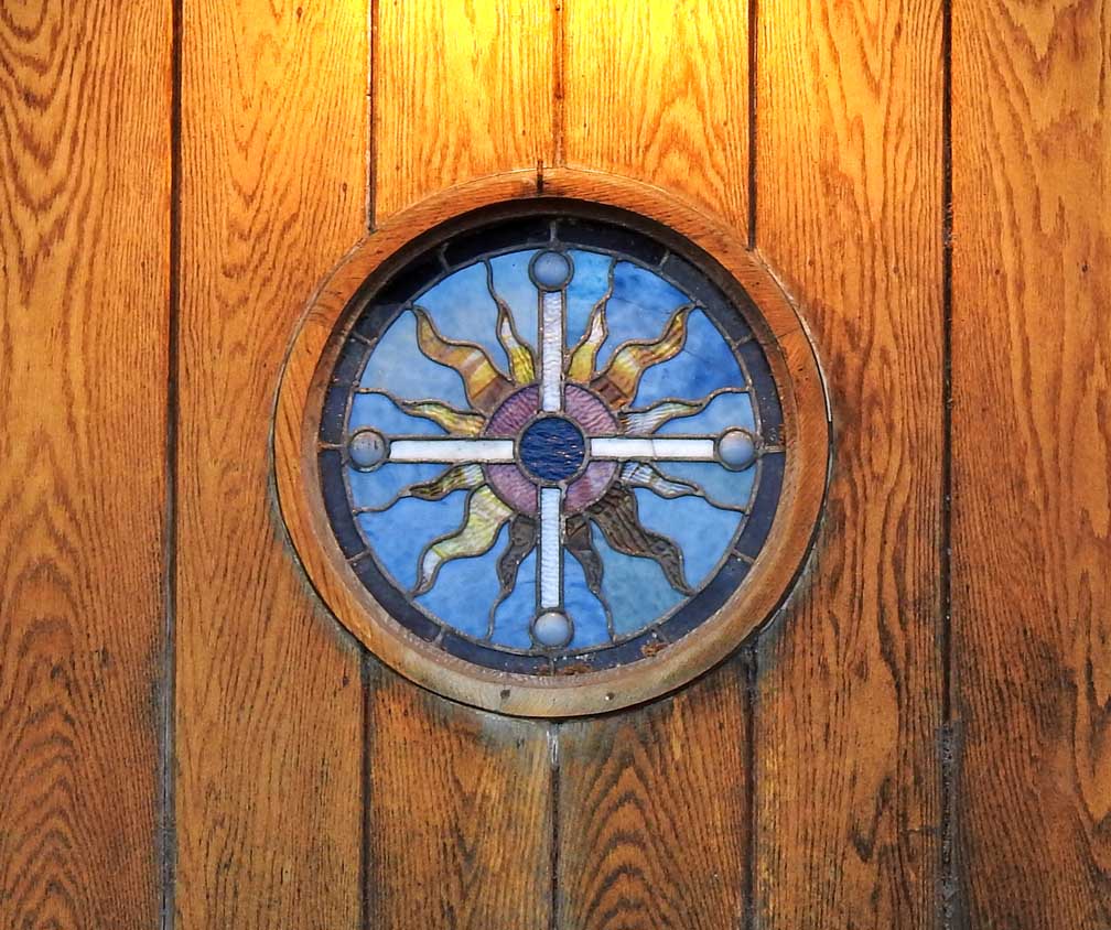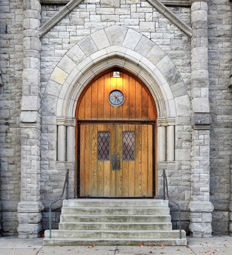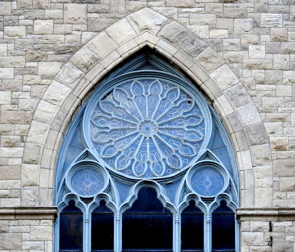 ![]() Gothic Revival ... Steeples removed c. 1932 ![]() Left/east tower Tower ... Belfry ... Vertical pier buttresses ... Voussoirs over entrance ... Onondaga limestone ![]() Left/east tower Belfry ... Trefoils in tympanums ... Broken rangework masonry ![]() Left/east tower Vertical pier buttresses at far sides ... Voussoirs over entrance ... Stained glass in quatrefoil tracery ... Leaded lattice glass ![]() Left/east tower Voussoirs over entrance ... Stained glass in quatrefoil tracery ![]() Left/east tower Leaded lattice glass .... Paneled door ![]() Center bay Bay ... Rose window, including vertical lights ... Voussoirs over entrance ... Stained glass in quatrefoil tracery ![]() Center bay Voussoirs ... Rose window above stained glass paired roundels and vertical panels - commonly found in the Gothic style in Europe ![]() Center bay Random ashlar stone pattern ... Voussoirs ... Stained glass roundel in tympanum above double oak doors with leaded lattice windows ... Compound arch ... Squat Gothic columns ... Vertical pier buttresses ![]() Center bay Roundel features opalescent stained glass ... Oak paneling ![]() Center bay and right/west tower |