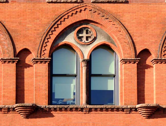 Gothic mullioned window with sawtooth molding ... Medina sandstone engaged column and sills ... Corbel-supported niches