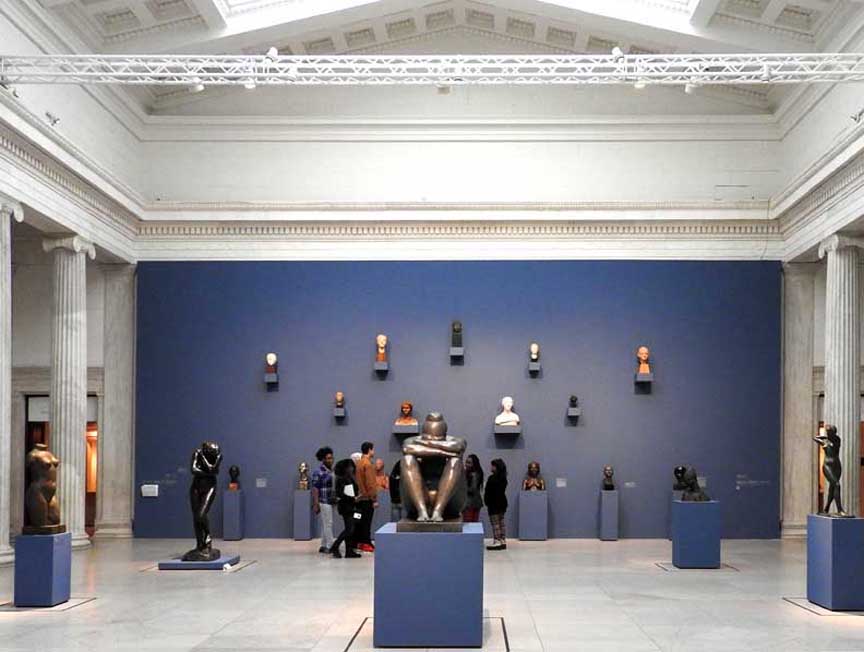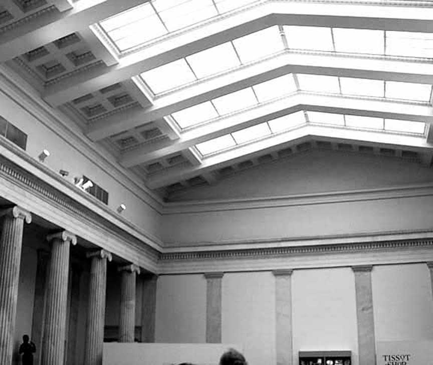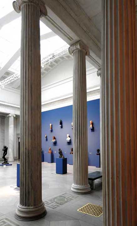 area. In adapting this plan to meet the requirements of a more modern art gallery, Green and Wicksentablatures, are among the museum's most elegant features, a fact recognized by the Gallery's directors, who have consistently resisted the temptation to remodel in these areas. In order to facilitate crowd flow, Green and Wicks' floor plan called for doorways connecting all galleries. The result, as noted by an English architect in 1911, was a loss of valuable wall space that could only be regained by blocking up some of the doors in the smaller galleries. This deficiency in Green's plan was noted and acted upon in later renovations. provided antechambers leading from the center of the north and south sides of the court into the picture galleries. The architectural serenity of these transepts, which are completed with columns supporting finely carved white marble The chief space of the