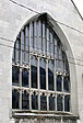 - Single recessed main portal flanked by upwardly receding buttresses bracketing a fine arched window with delicate tracery