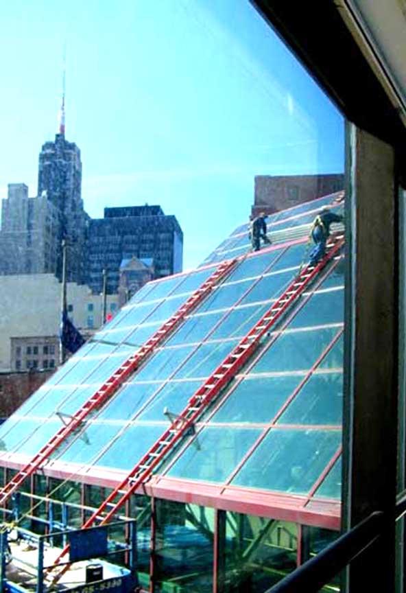 Exterior![]() Flanking glass pavilion (atrium) - in Postmodern style - is a 1984 addition to the former Genesee Building at right Left: Berger's Department Store/Belesario Apts. ![]() Tall building in background: Rand Building ![]() Window washers at work |