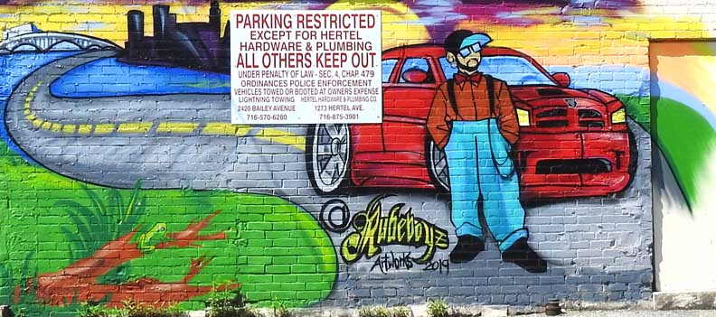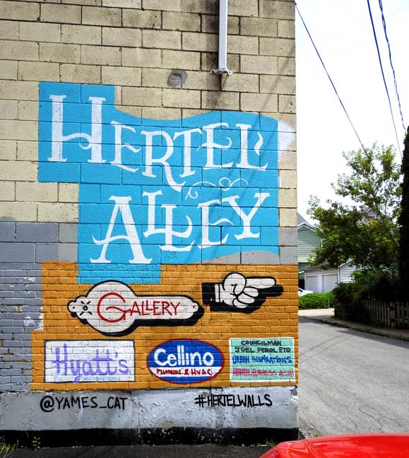 Partial reprint The Inaugural Hertel Alley Street Art Festival By Queenseyes Buffalo Rising, April 9, 2019 (online June 2019) ![]() Delaware District council member Joel Feroleto and Street artist Vinny Alejandro on Hertel Alley ... Around that same time [last summer], I [Queenseyes] reached out to Delaware District council member Joel Feroleto, to see if there were any urban street art opportunities in North Buffalo. Feroleto has been championing the mural scene in his district, which coincided with Albright Knox’s charge to elevate the large scale mural movement in Buffalo. A couple days later, I met up with Feroleto and [Vinny ] Alejandro to walk Hertel Alley between Traymore and Colvin – the alleyway extends a number of city blocks, running parallel to Hertel. When Alejandro first scoped out the alley, he almost fell over. “This is exactly what other cities are doing,” he said. “These walls are all prime for art, and we need to incorporate a festival aspect.” Feroleto agreed, and told us that he would start talking to the building owners, and the business owners. ![]() Street artist Vinny Alejandro Fast forward 9 months, and the Hertel Alley Street Art Festival is born. The event, sponsored by the Hertel Business Association, will take place over the course of two days – Saturday, June 1 and Sunday, June 2. (2019). Alejandro is taking the lead on this festival, and told me, “It’s going to be an explosion of street art, in an alley that could use some attention – it’s not very welcoming, but after the event, people are going to want to see how vibrant it has become. We have street artists coming in from Rochester, LA, and even Nebraska – there will be 20 artists painting throughout the weekend. This is the type of event that put Philadelphia and Miami on the map for an art genre that has not existed in Buffalo until now.” “This will transform the Hertel Alley into a destination and have a positive impact for all of North Buffalo,” said Feroleto. “Public art on Hertel has been embraced by the neighborhood and has a positive economic impact on the business. It is also getting national recognition, as the ‘Hertel Walls’ have been mentioned as a place to visit Buffalo in national publications such as the Washington Post and Chicago Tribune.” |