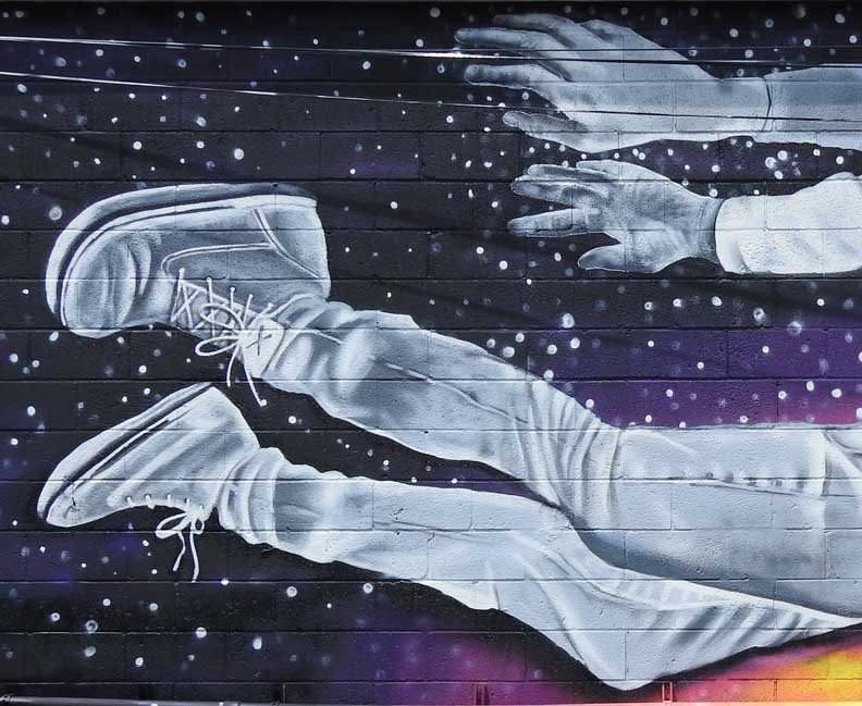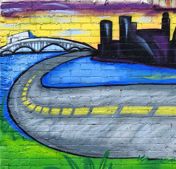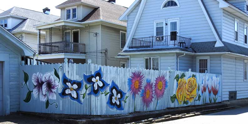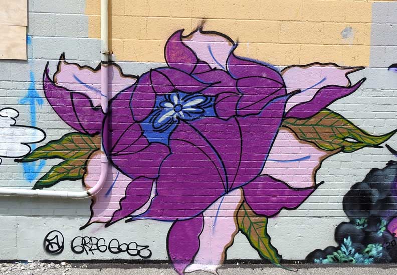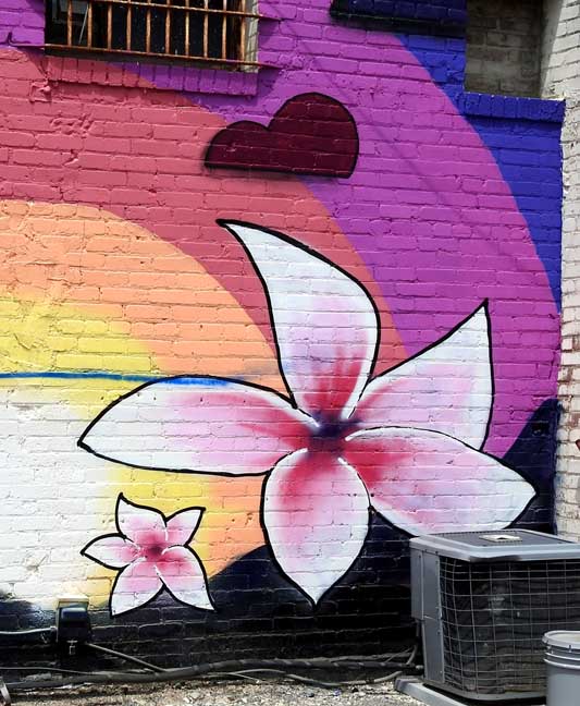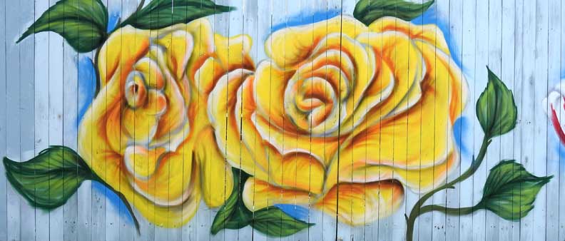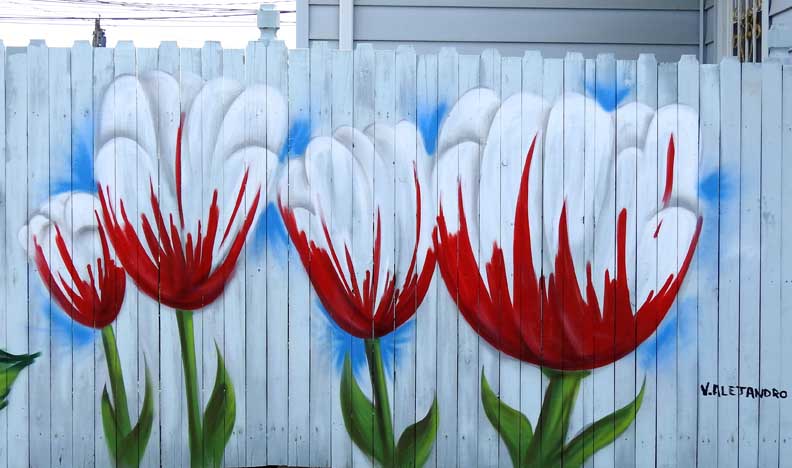 ![]() Mural By Mark Adamusik ... Dark blue line is the result of vandalism ![]() Horizontal dark blue line is the result of vandalism ... Vase with smoke ... Artist's signature ![]() ![]() Horizontal dark blue line is the result of vandalism ... Note hand holding a rose stem above the boom box |