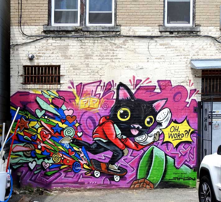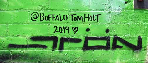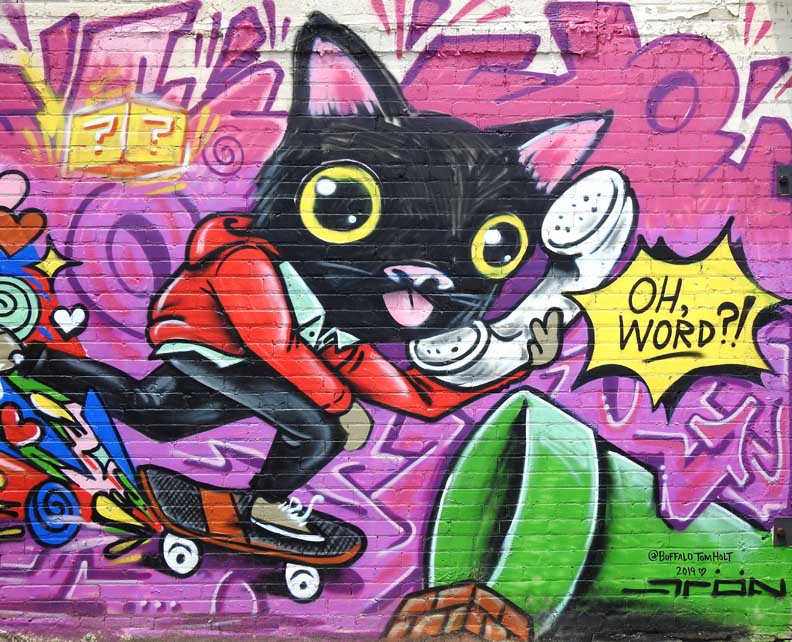 | Oh Word ?! by Tom Holt ![]() Oh Word ?! by Tom Holt ... Details below: ![]() Oh Word ?! ![]() Oh Word ?! ![]() By Tom Holt ![]() Tom Holt Photo courtesy of Buffalo Spree, October 2019 "Tom Holt moved to Buffalo in 2002, after finishing his art degree. In Buffalo, the best expression of Holt’s mural style is in North Buffalo’s Hertel Art Alley, best described as not far from the Sunoco station on the corner of Hertel and Colvin Avenues. Sometimes called Oh Word in reference to the text that appears on it, it features a cat (modeled after Holt’s own pet cat) with a human body riding a skateboard, contrasted against a bright fuschia background." - Buffalo Spree, October 2019 |