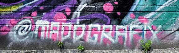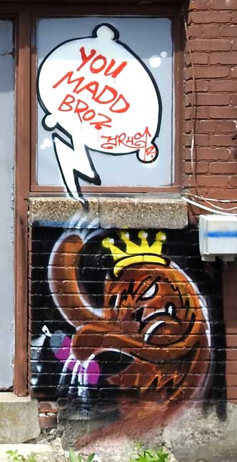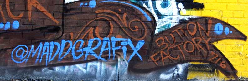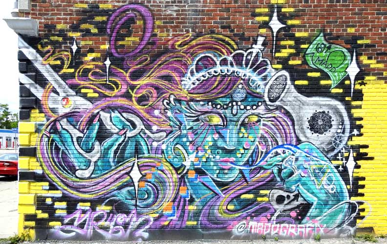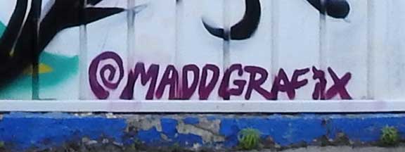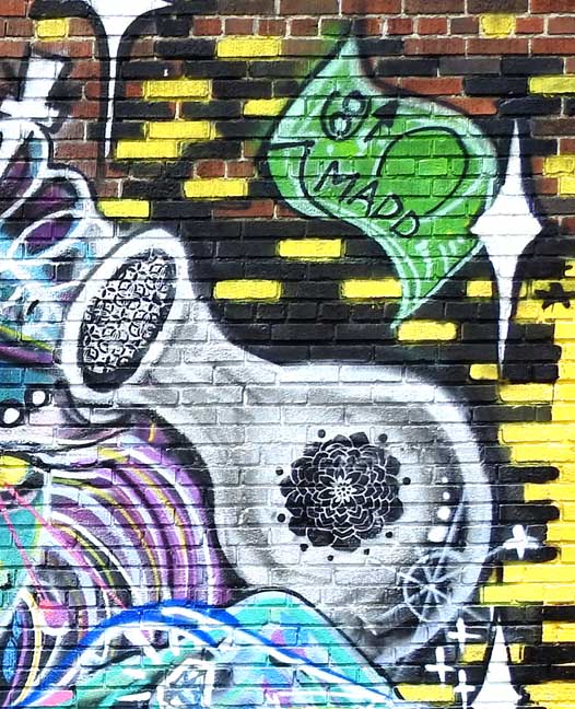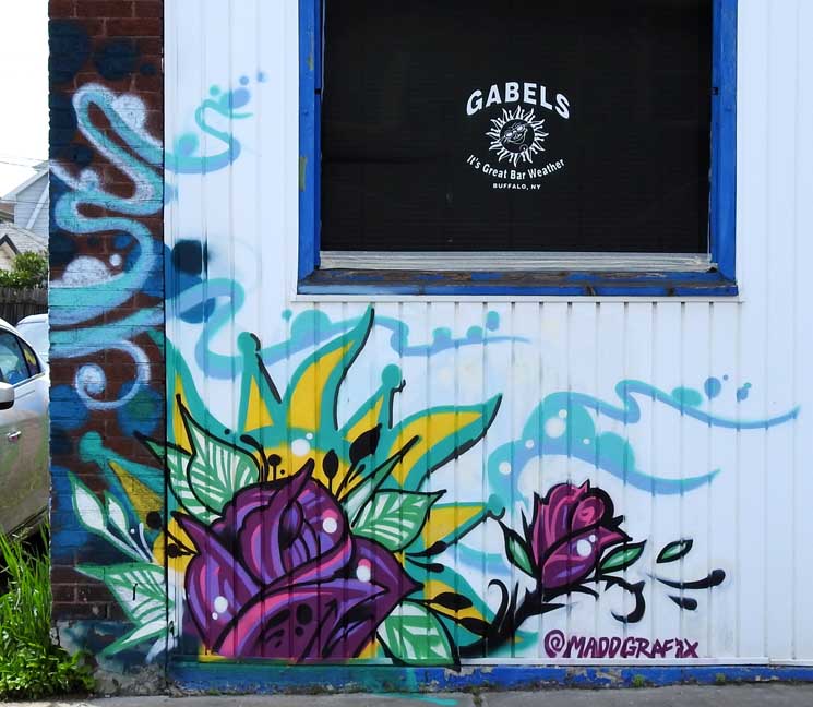 ![]() ![]() Roses ... Artist's signature, detailed below: ![]() Maddgrafix: "...a local custom art/graphics studio, providing quality commercial, promotions,and event productions." - Mark Madden's Facebook page ![]() Maddgrafix is owned by Mark Madden, shown here at Cantina Loco, 191 Allen St ... Photo source: Mark Madden's Facebook Page ... See also below and another, below ![]() Also by Maddgrafix(?) |
