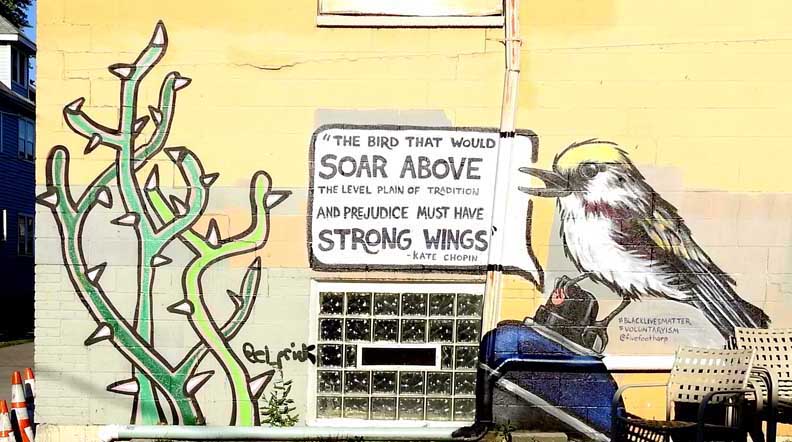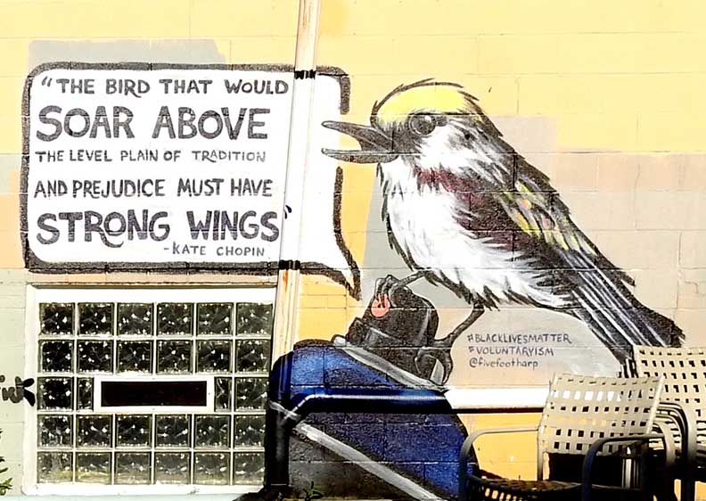 ![]() ![]() ![]() RIGHT MURAL: LATER ADDITION - PHOTO TAKEN AUGUST 12, 2020 ![]() ![]() LATER ADDITION - PHOTO TAKEN AUGUST 12, 2020 “The bird that would soar above the level plain of tradition and prejudice must have strong wings. It is a sad spectacle to see the weaklings bruised, exhausted, fluttering back to earth.” - Kate Chopin, The Awakening ![]() LATER ADDITION - PHOTO TAKEN AUGUST 12, 2020 ... By Elyssa Harper, fivefootharp ... See also below |