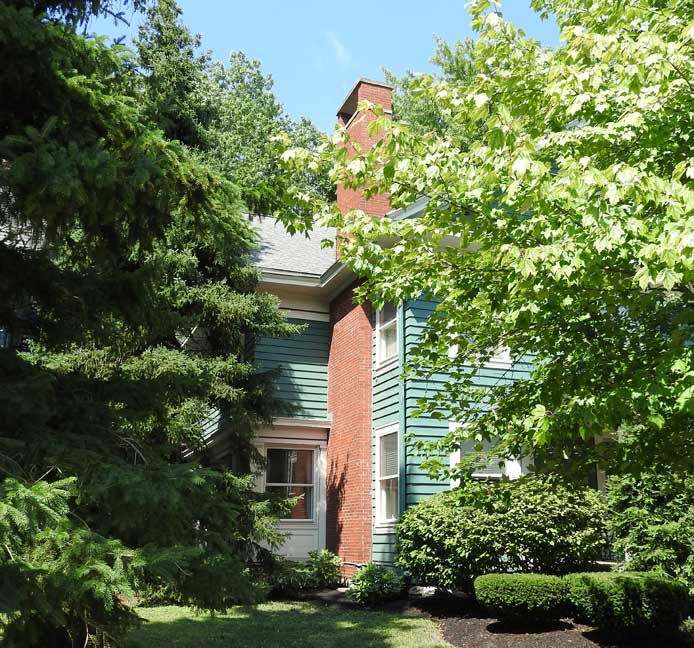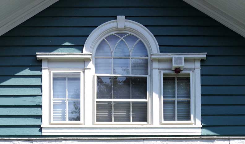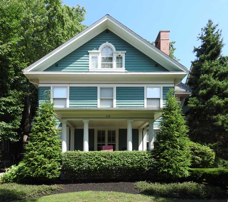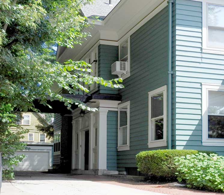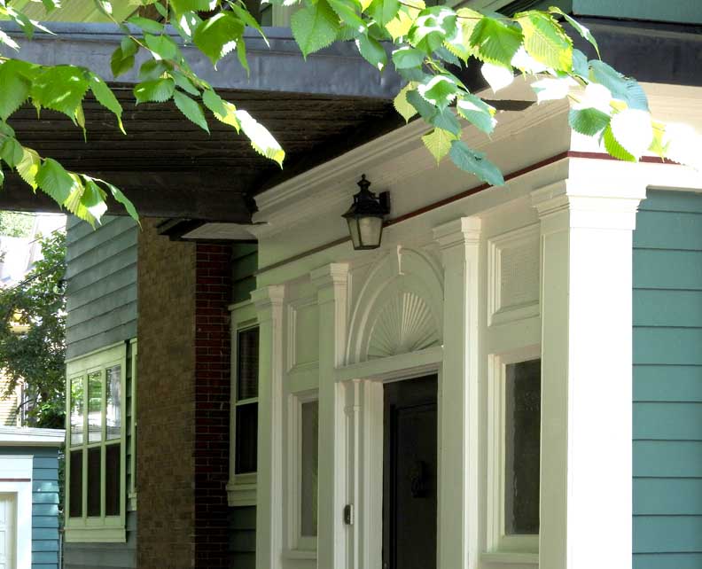 | Facade July 2018 photos ![]() ![]() Colonial Revival style ... Details below, starting at the top: ![]() Palladian window ![]() Doric columns and pilaster ![]() Doric columns and pilaster and iron balustrade ![]() Side entry with large canopy ![]() Side entry: Pilasters ... Sidelights ... Blind arch with keystone and fan decoration ... Large canopy ![]() Wing on right side (east) of the house |