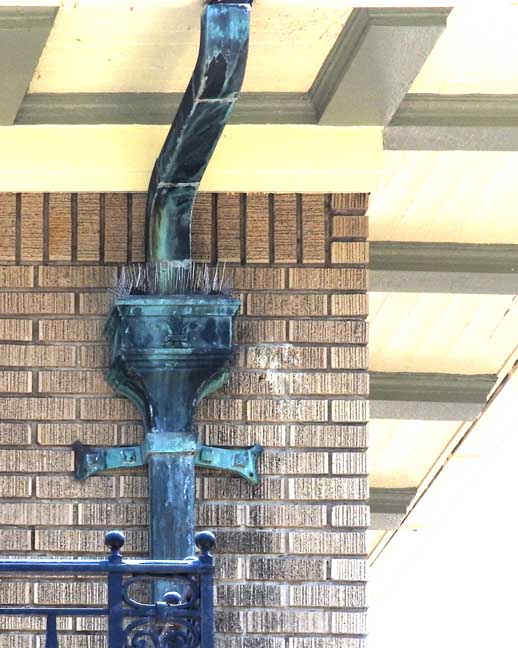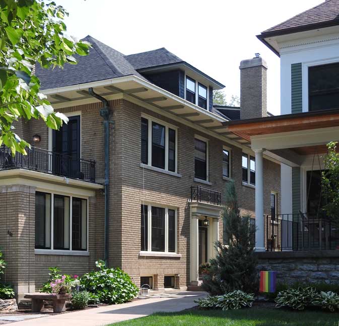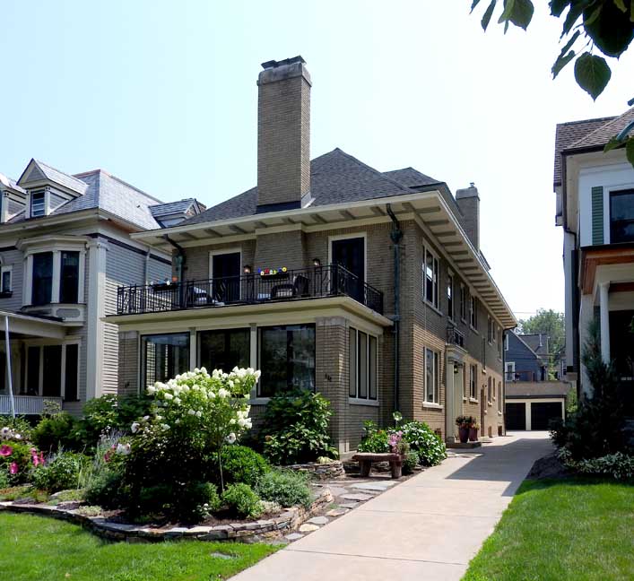 Facade![]() 2 1⁄2-story hipped roof frame duplex with Prairie styling. ![]() Left (east) house number: 691 - Second floor ... Right (west) house number: 689 - First floor ![]() #689 first floor enclosed porch ... #691 second floor porch ![]() Copper conductor head and downspouts ![]() #691 second floor French doors ... Wrought iron balustrade ![]() #689 first floor wood Tuscan pilaster ... Leaded casement windows |
