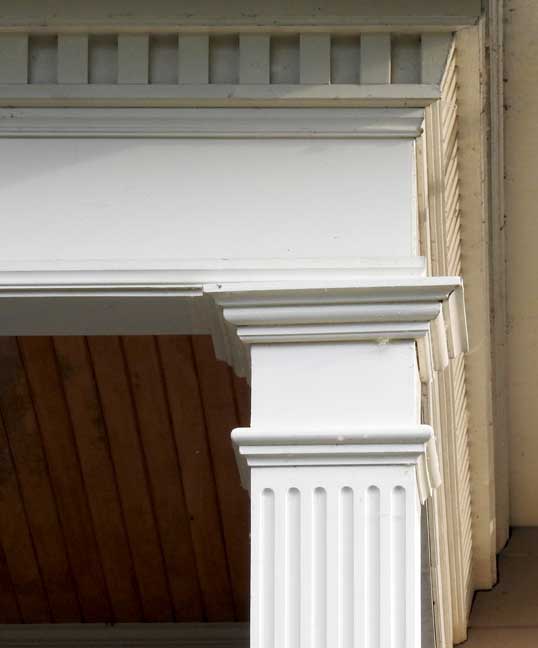 Ovals and flutes decorate the frieze   ...   Twin Ionic  capitals   ...   Shell   ...   Fluted  pilaster    ...    Fluted engaged  column