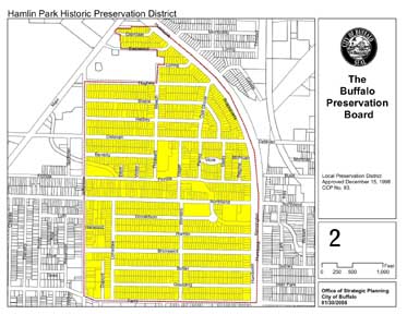 A Designated Local Preservation District, approved December 15, 1998, Common Council Proceedings Item No. 93. All exterior construction, reconstruction, demolition, or redevelopment work to be performed on any structure or site within the Hamlin Park Historic Preservation District must be undertaken in conformance with the Preservation Standards and Project Review Procedures, as defined in Chapter 337 of the Charter and Ordinance of the City of Buffalo, New York, as administered by the City of Buffalo Preservation Board.