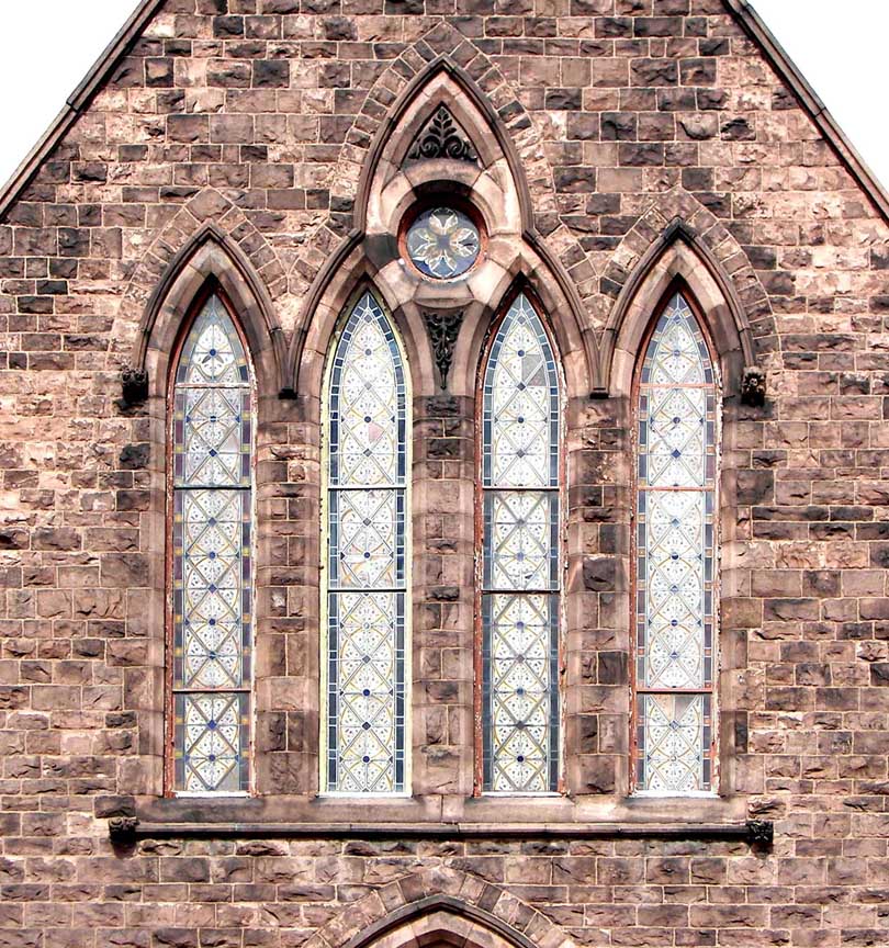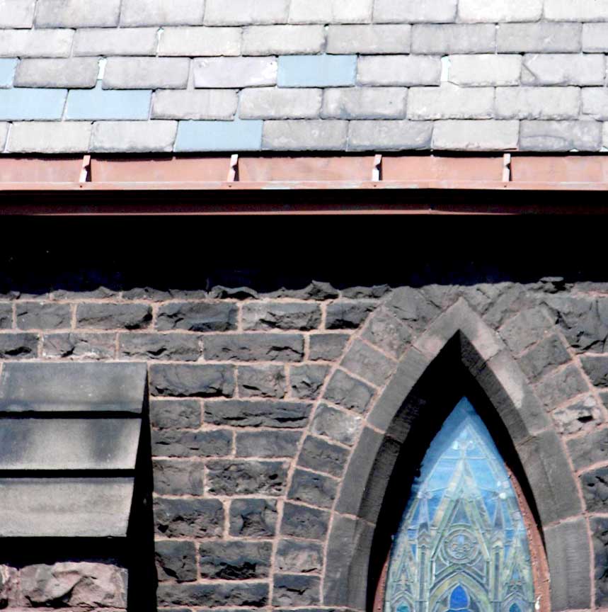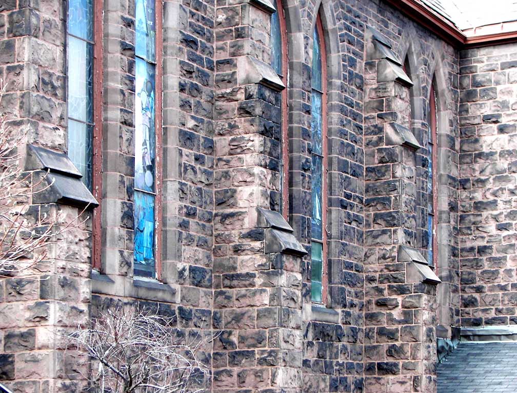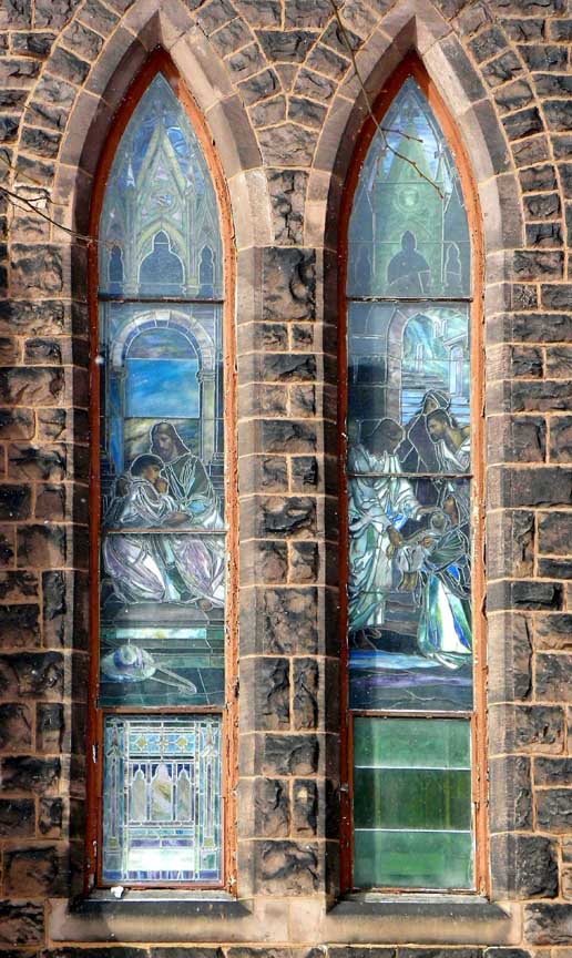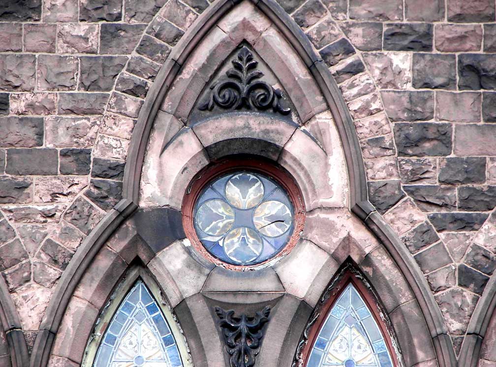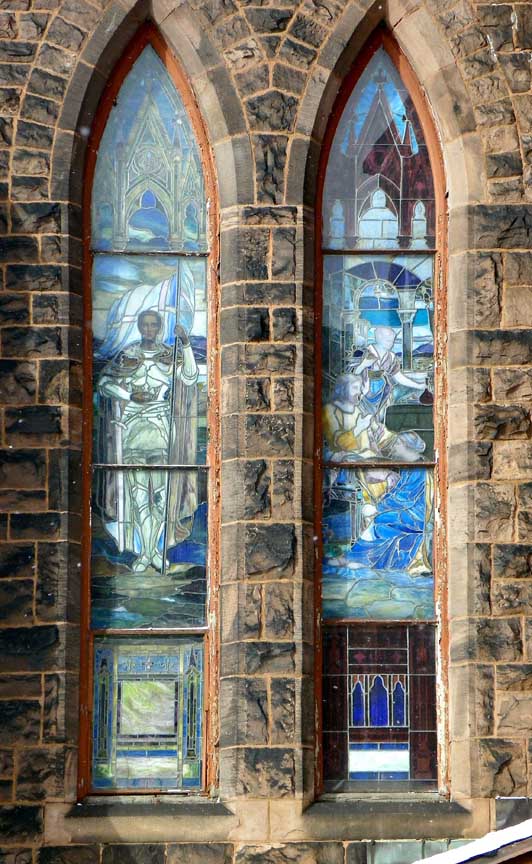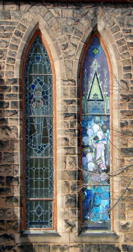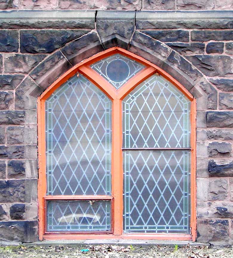 East elevation ![]() East transept at right ![]() East nave: Bishop's Window / Angelic Orchestra ![]() East nave: Prodigal Son / Jesus Heals the Sick ![]() East nave: St. George / Jesus with Mary and Martha ![]() East elevation entrance ... Note basement lattice window at left bottom, detailed below: ![]() Lattice window ... Gray outline is lead came. |