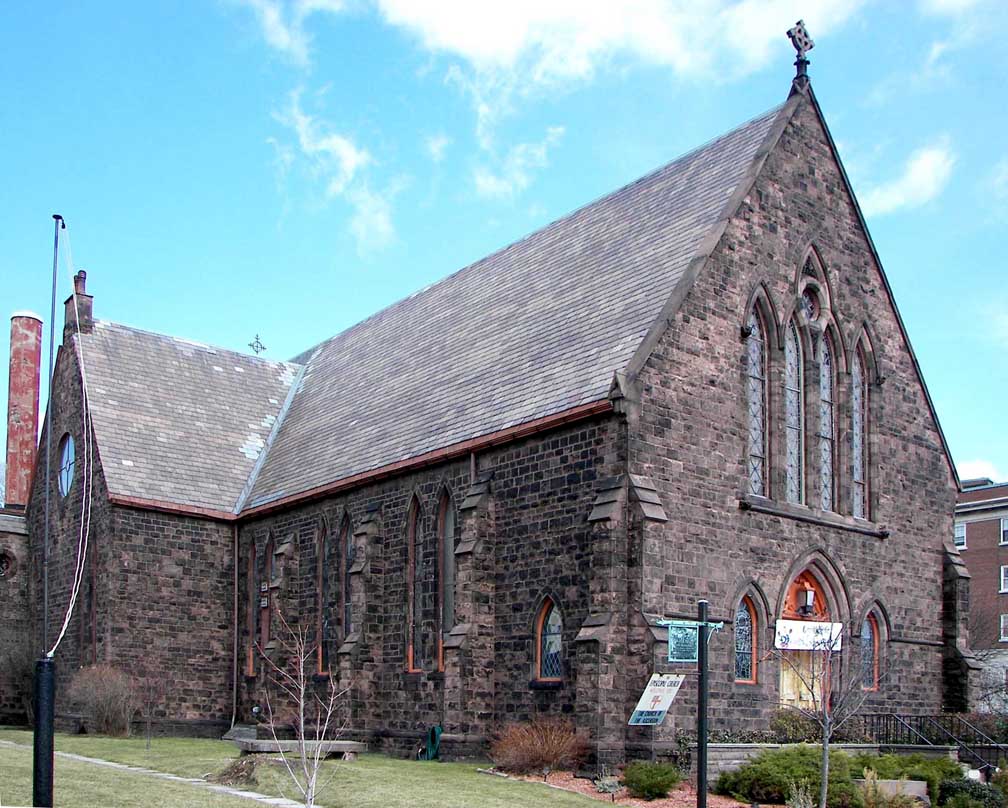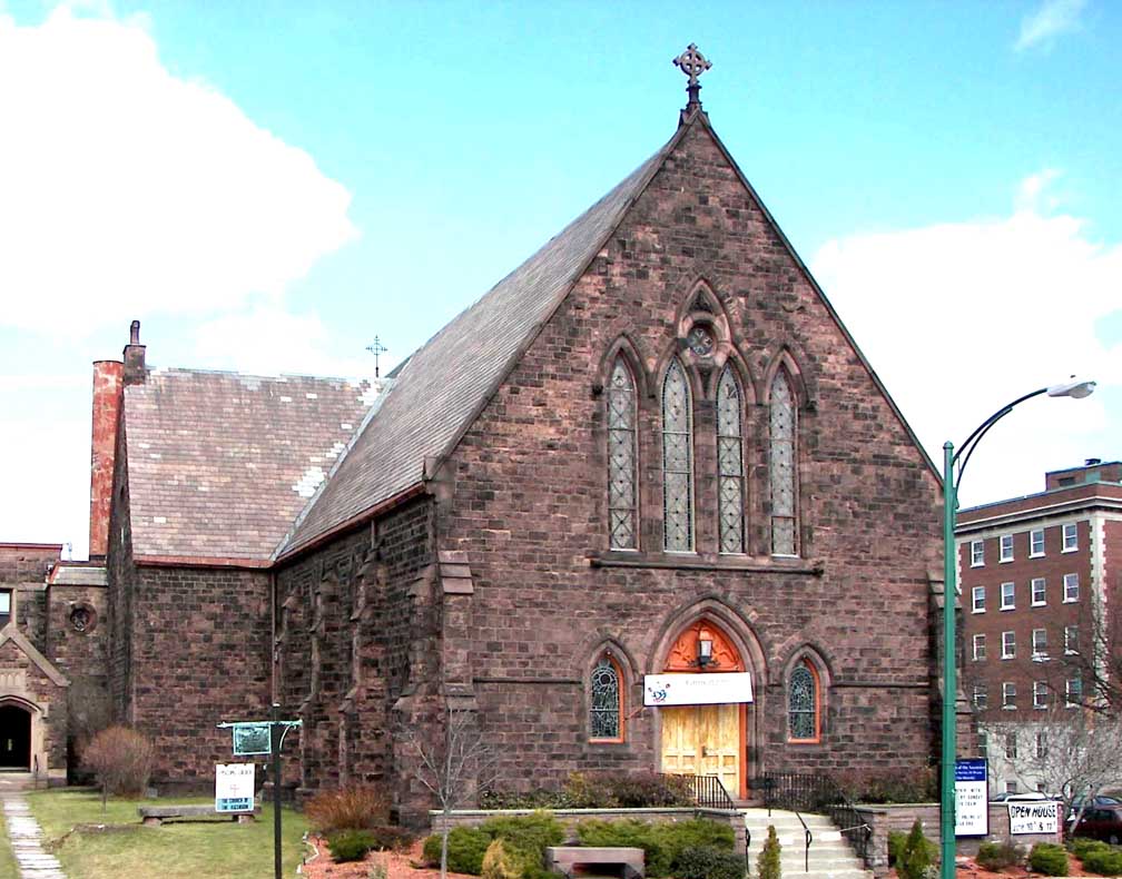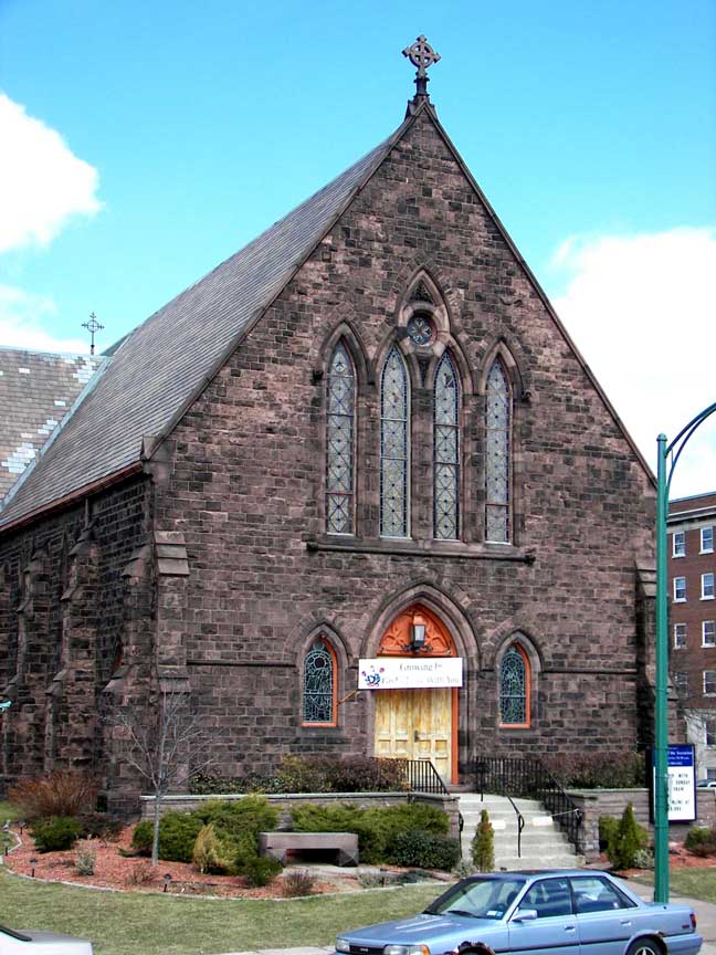 ![]() Historic plaque in front of the church ... Guide Board Road was changed to North Street in 1854 when the city's boundaries expanded to North Street. ... See map. ![]() Medina sandstone sidewalk ![]() Facade ... Guild House is located to the left (not in this photo): ![]() Medina sandstone Guild House (Church to the right, not in this photo) ... 6 over 6 lights. First floor adds 6 over 6 transom lights ![]() West transept and nave ... Vertical pier buttresses ![]() Facade ... Gothic Revival ... Medina sandstone ... Cross pattée finial at top of roof ... 4-paneled geometric window ... Vertical pier buttresses ![]() Voussoirs with end corbels ... Anthemion in tympanum ... Round stained glass window ... 4-paneled geometric lancet window ... Medina sandstone sill above corbeled stringcourse ![]() Anthemion in tympanum ![]() West elevation ... Vertical pier buttresses ... Belt course at right ![]() Slate roof ... Bottom left: Vertical pier buttresses ![]() West elevation ... Vertical pier buttresses ... West nave stained glass windows |