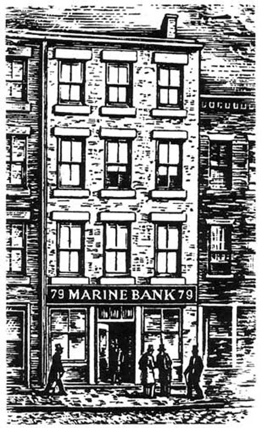 Buffalo: Lake City in Niagara Land In the summer of 1850, eight men gathered in Buffalo to form a new commercial bank. They had come from throughout the state -- General James S. Wadsworth of Geneseo, J. P. Beekman of Kinderhook, John Arnot of Elmira, John Magee and Constant Cook of Bath, William R. Gwinn of Medina, and George Palmer and James M. Ganson of Buffalo. [Both Palmer and Wadsworth of Buffalo had railroad connections. The two had financial interests and served as directors of the Attica and Hornell Railroad, while Palmer had links also with the Buffalo and State Line Railroad.] The geographic diversity of the men indicated that the plan was to extend eventually the bank's services across the state. [By 1981,] Marine Midland Bank N.A. accomplished that goal and has gone even further. It was the nation's 13th largest commercial bank with about 300 banking offices in more than new York communities and about 25 offices in foreign countries. Marine Bank was founded as a state-chartered bank on July 10, 1850, with capital of $170,000. Palmer was elected president and Ganson was named cashier. The new institution was called Marine Bank because much of its early business depended on the economic vitality of the city's lakefronts and riverfronts. From the first day it opened its doors on August 27 at 79 Main Street, Marine was the prominent bank for the thriving grain and milling industry on the waterfront. By the turn of the century, Marine Bank of Buffalo began to expand through merger. In 1897 it absorbed the American Exchange Bank and in 1902 it acquired the Buffalo Commercial Bank. That same year it became a national bank and changed its name to Marine National Bank of Buffalo. The next acquisition came in 1913 when Marine absorbed Columbia National Bank. Six years later Bankers Trust was acquired. Marine chose to become a state bank again, this time under the name Marine Trust Company of Buffalo. By the mid-1930s, Marine had acquired eight other banks. Marine had also taken the lead in the formation of Marine Midland Corporation, a holding company for affiliating 17 banks throughout New York. That first multibank holding company in the state was formed October 4, 1929. As a result of 11