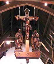 The building, constructed at a cost of $100.000 is designed in the English Gothic Style. The interior, with its wood paneled ceiling, contains the rood beam from the original church. Handcrafted in Belgium, the beam, depicting the Crucifix, Mary and St. John, is prominently hung in front of the chancel.