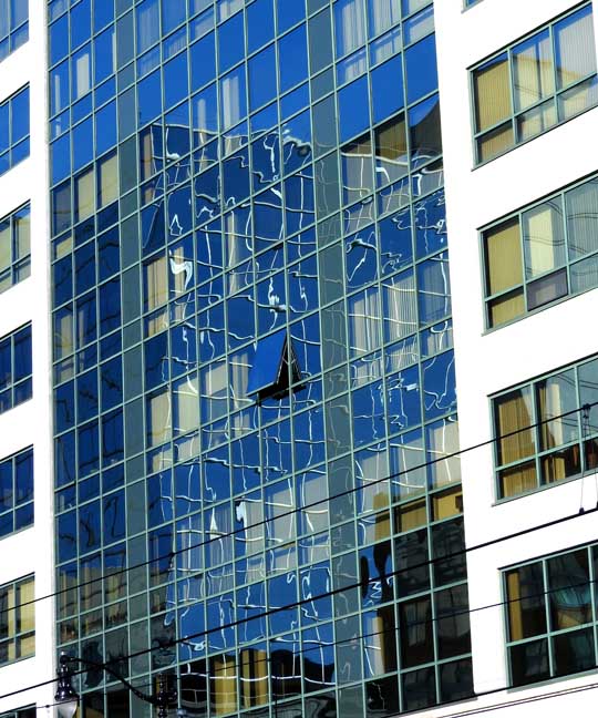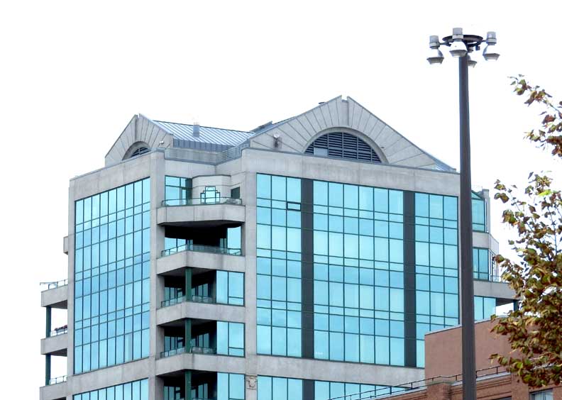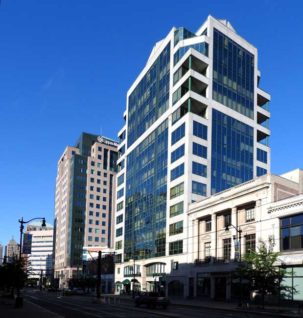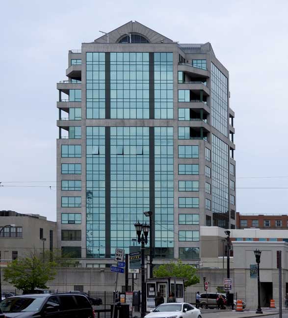 ![]() Left horizontal building: 2 Fountain Plaza Bank of America ... Tan colored building to right of Bank of America: 40 Fountain Plaza Key Center ... Blue tinted glass building: City Centre ... Right of City Centre: 620 Main Street ![]() City Centre reflection on the glass ![]() Main Street facade ![]() Rear of building ... Pearl Street elevation. ![]() Postmodern features: Broken pediment roofs ... Balconies ... Stringcourse ... Color. International style feature: Curtain wall |
